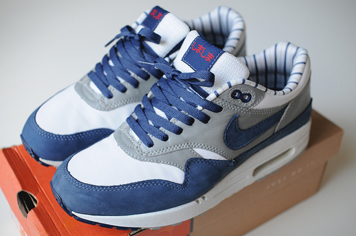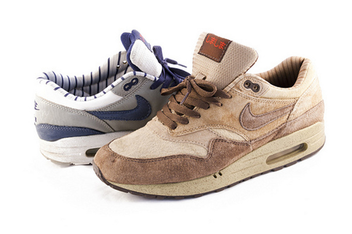 Je vous propose encore des modèles appartenant à ce que j’appelle l’âge d’or de la AM 1. Ce pack Nike Air Max 1 Shima Shima a débarqué en 2003. Des inscriptions en japonais figurent sur la semelle intérieure et la languette. Le modèle style usé a beaucoup d’allure. Dans le lot, vous avez également une Nike Air Trainer, que j’espère vous montrer dans un autre article.