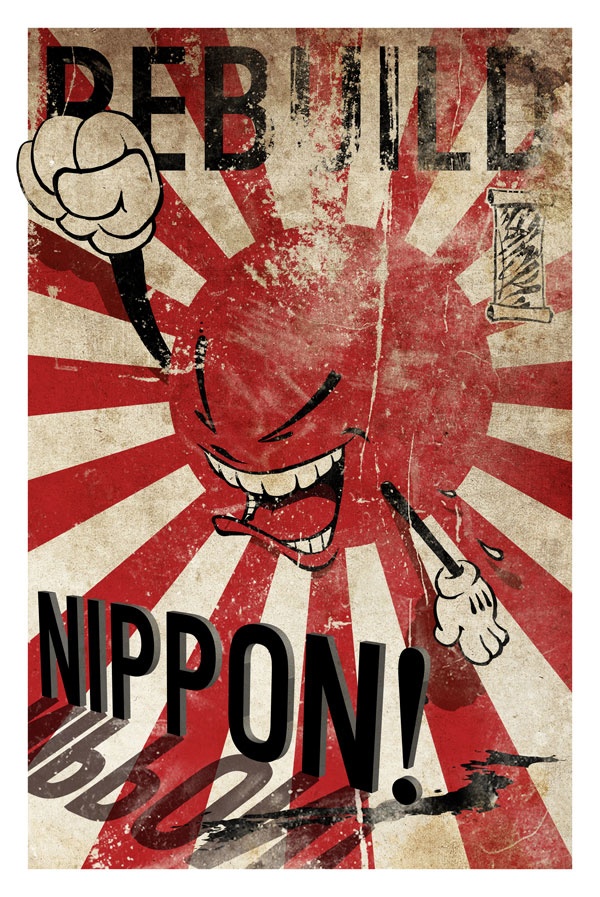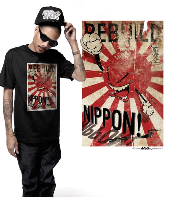 L’artiste Dissizite a créé un tee-shirt » Rebuild Nippon » dont les bénéfices seront intégralement reversés à des oeuvres caritatives pour le Japon. Il a vraiment fait du très bon boulot ! Le dessin me fait penser à une affiche de propagande communiste…. Une belle initiative dans la lignée de celle de Fragment et de Stussy. Il est possible de pré-commander le tee-shirt ici pour 30 dollars.