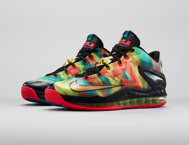 Nike nous gratifiera de 2 nouvelles Lebron 11 ce week end. La première utilise un motif multicolore tandis que la seconde est à dominante rouge avec quelques accents dorés.