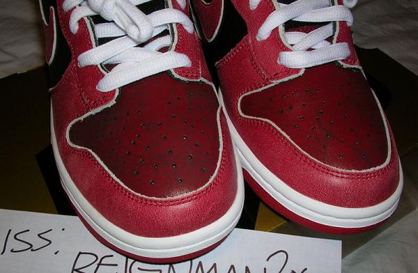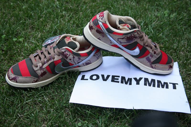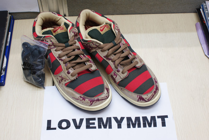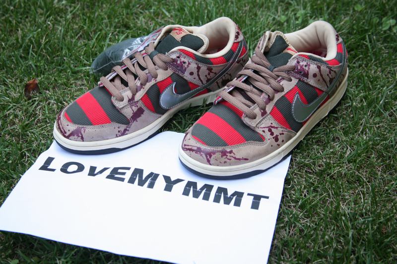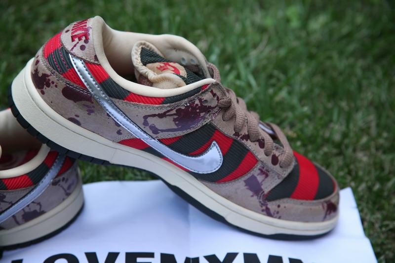 La Nike SB Dunk Low Pro Freddy Krueger est sortie en 2007. Les rayures rouges et noires de la paire s’inspirent du pull porté par le tueur. Le Swoosh couleur argenté, nous rappelle ses griffes. Le cuir marron avec des taches de sang évoque l’univers glauque du film. L’imprimé de la semelle intérieur nous renvoie au visage brûlé de Freddy Krueger.