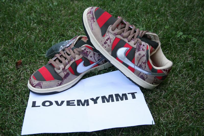 La Nike SB Dunk Low Pro Freddy Krueger est sortie en 2007. Les rayures rouges et noires de la paire s’inspirent du pull porté par le tueur. Le Swoosh couleur argenté, nous rappelle ses griffes. Le cuir marron avec des taches de sang évoque l’univers glauque du film. L’imprimé de la semelle intérieur nous renvoie au visage brûlé de Freddy Krueger.