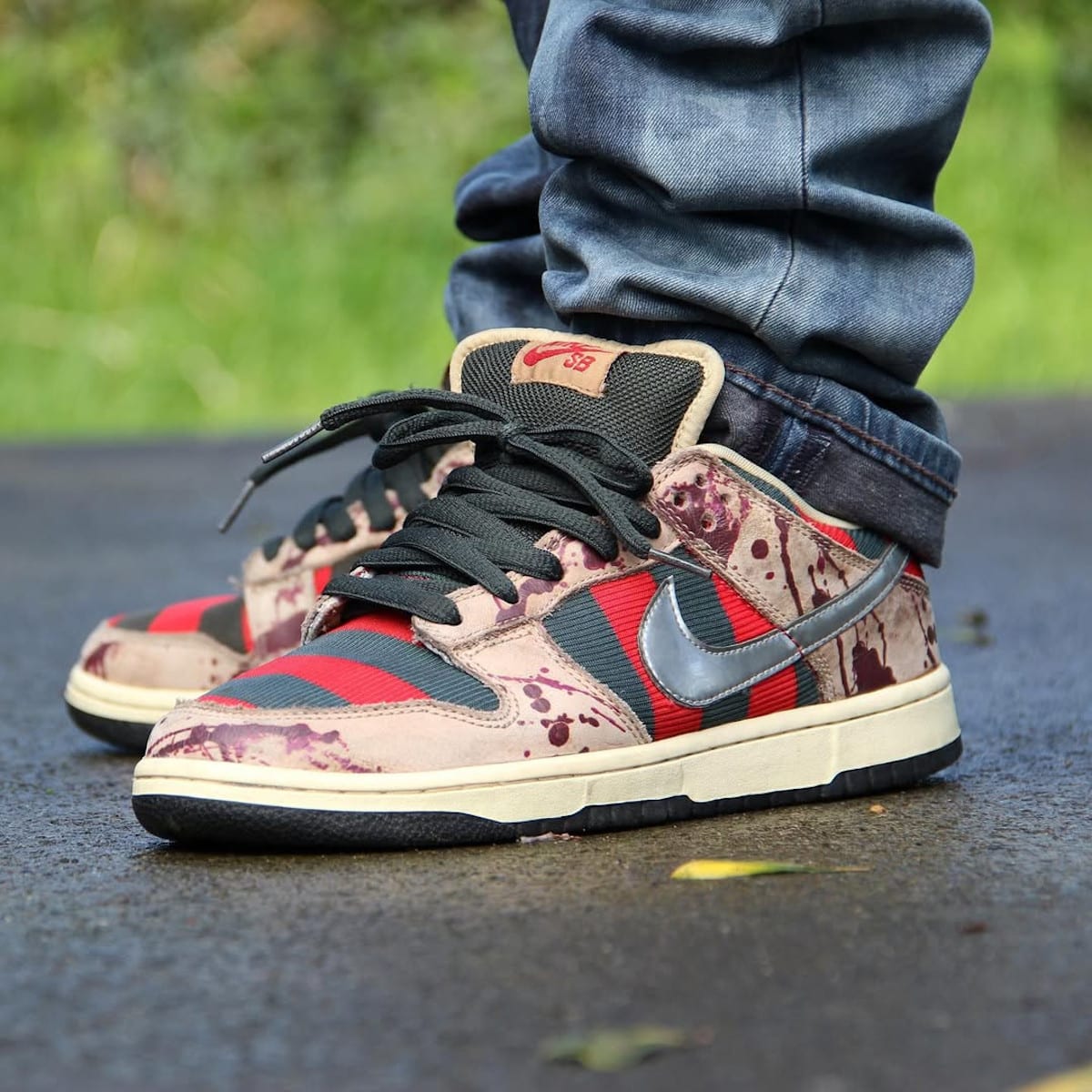 Commençons par le boss final. La Nike SB Dunk Low Freddy Krueger. 2007. Pull rayé rouge et vert tissé sur la partie supérieure. Du sang qui coule sur le cuir. Un Swoosh métallique façon lames de rasoir. Vous rêvez déjà ? Normal.