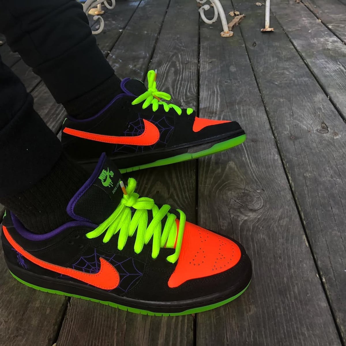 En 2019, Nike Skateboarding sort le modèle parfait. La Nike SB Dunk Low Night of Mischief. Tout y est. Toiles d’araignées brodées sur le noir. Citrouille vampire sur les semelles intérieures. Lacets bicolores type bonbon. Semelle verte fluo qui pue la citrouille pourrie. Le genre de paire qui raconte une histoire effrayante sans dire un mot. Vous la sortez du placard. Les gens comprennent direct. C’est Halloween. C’est la fête. C’est limite gore mais fun. Prix actuel ? 479 euros. Raisonnable pour le niveau de détails. Nike a vraiment soigné chaque élément. Le Swoosh orange. Le vert slime sur la languette. Même les aglets ressemblent à des bonbons. Cette paire résume tout. L’esprit skate. La culture horror. Le fun sans prise de tête. Une réussite totale.