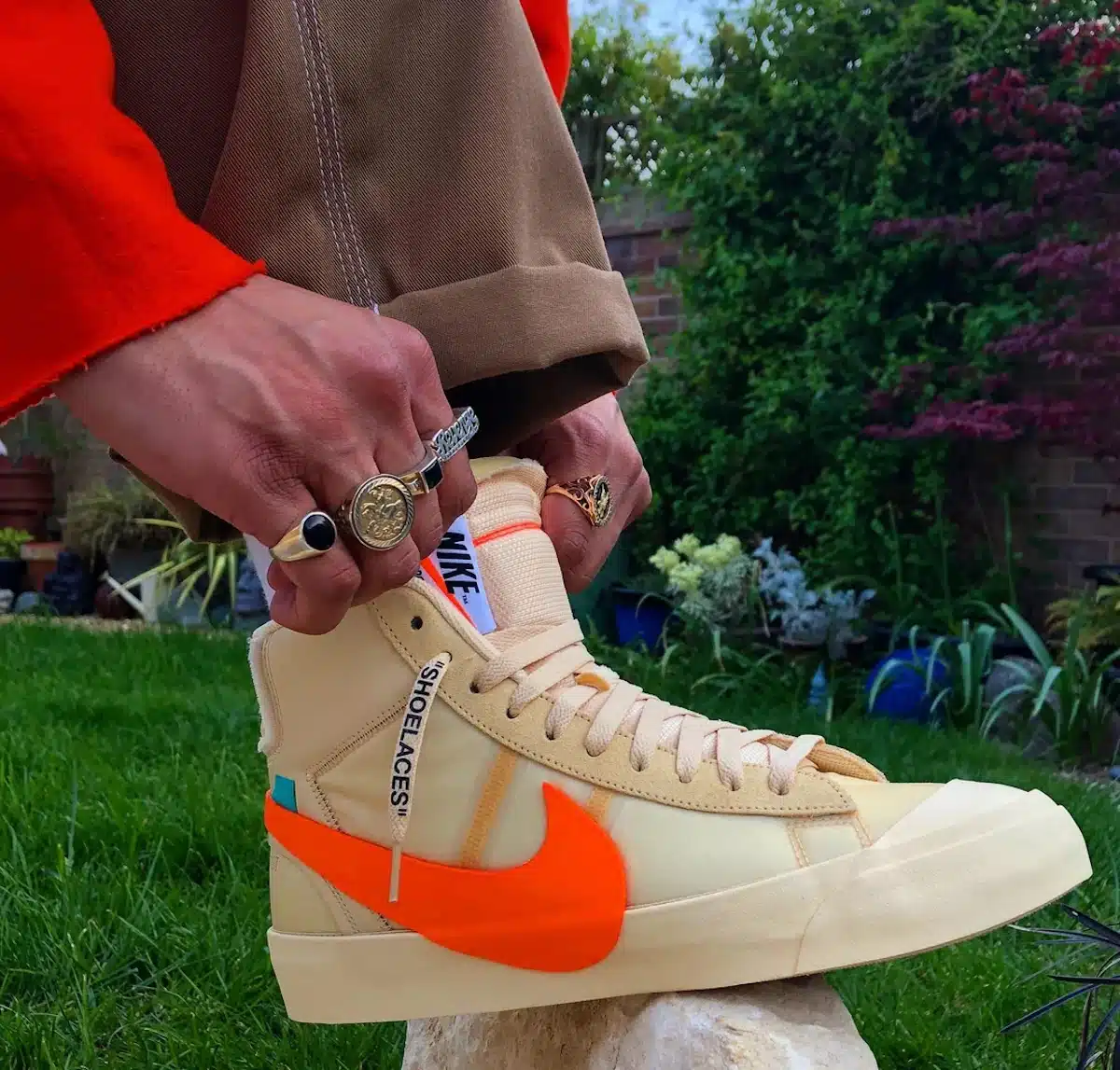 Courant octobre 2018, Virgil Abloh sort sa Blazer Mid. Pour Halloween. Orange citrouille. Beige fantomatique. Swoosh déstructuré. Les codes Off-White au complet. Le timing est parfait. Le designer est au sommet. Ses collaborations Nike s’arrachent. Celle-ci devient instantanément un collector. Pas la plus chère du lot. Mais tellement désirable. 600 euros aujourd’hui. Moins que prévu ? Peut-être. La collection Off-White reste solide. Certains modèles valent 2 000 euros. Celui-ci reste accessible… Bon, presque.