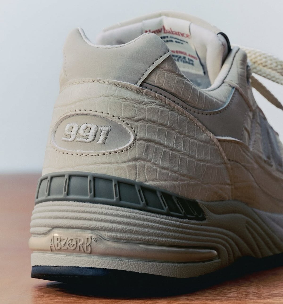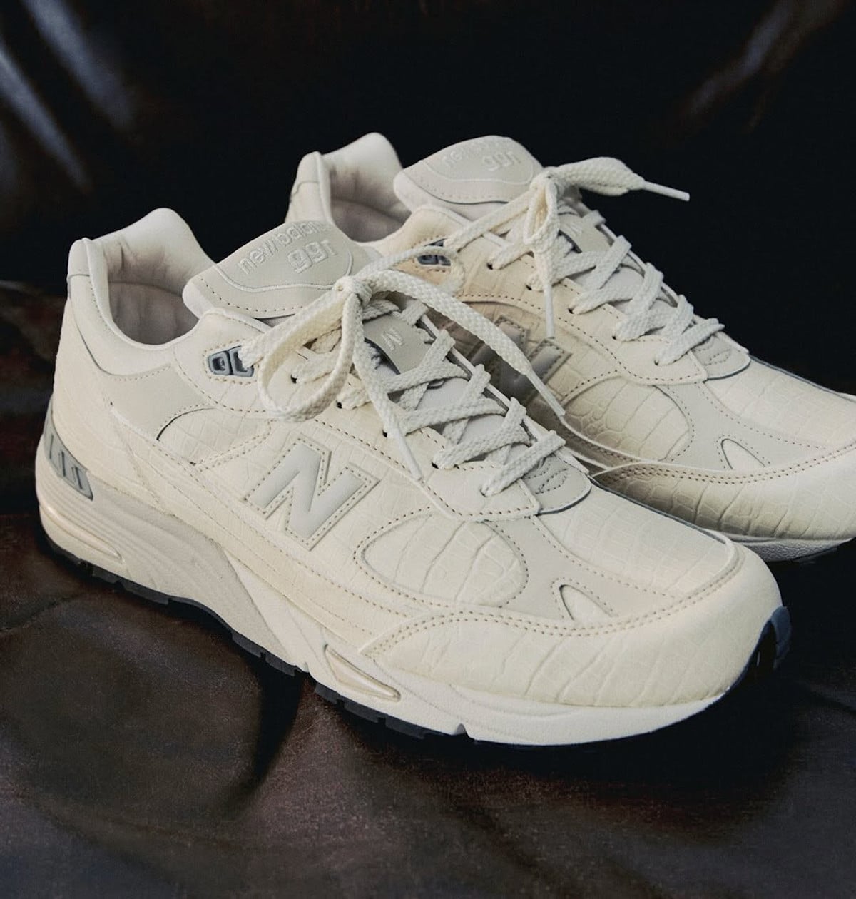 Pour la M991CR1, NB a joué la carte de la matière pure. Le cuir utilisé, c’est du veg-tanned, tanné aux tannins végétaux naturels. Il s’agit d’un procédé artisanal bien plus long que le tannage chimique industriel. Par-dessus, une texture crocodile embossée en creux sur toute la tige. La palette ? Crème, du gris très doux, une micro-touche de pistachio (une nuance de beige). Un colorway tonal, donc, tout en camaïeu, sans contraste agressif. Et surtout, une general release signée Teddy Santis : aucune collaboration, pas de co-signataire. NB tout seul, avec son cuir et ses écailles.