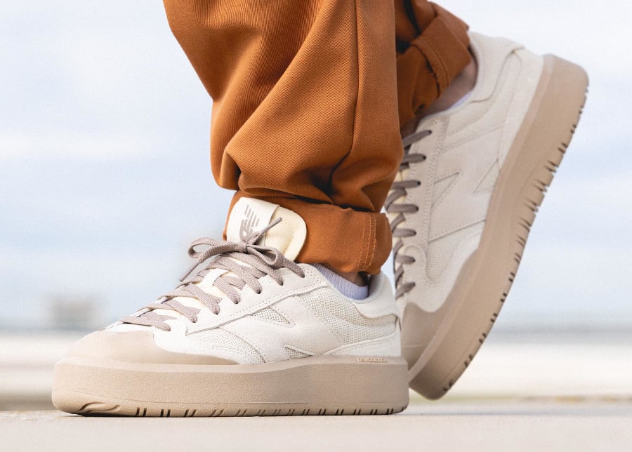 Oublions un peu les 2002R et BB550 pour nous focaliser un peu sur la New Balance CT302. La nouvelle silhouette offre une vision moderne de la chaussure de tennis. Les CT1500, 288 et CT300 sont des pures baskets rétro. La New Balance CT302WB Beige Bone Mindful Grey montre que cette dernière aurait sa place dans la catégorie des chunky sneakers. Sa grosse semelle lui confère une allure de modèle à plateforme. La midsole demeure tout de même moins volumineuse que celle d’une Vision Racer de Jaden Smith. A l’instar de la Nike All Court, sa toe box est munie d’un renfort en plastique. Ce petit détail la rend facilement identifiable. Bref, cette NB couleur crème et aux lacets marron noisette est à croquer. La Black Calm Taupe vaut aussi le détour. Une review sera mise en ligne dans les plus brefs délais.