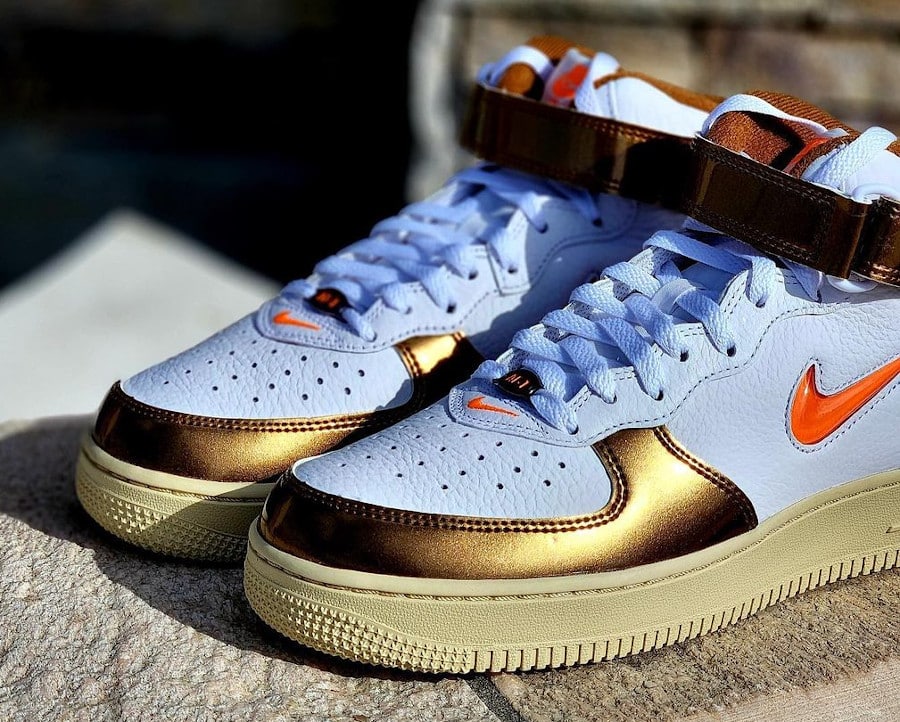 La marque fondée par Phil Knight a conçu une édition limitée qui revisite la Independence Day 2022. Exit les couleurs du drapeau des USA. Néanmoins, la Nike Air Force 1 Mid QS Ale Brown conserve le cuir premium blanc. La basket rétro se distingue au moyen d’un Jewel Swoosh orange et de parties affichant du marron métallique tirant vers le doré. Une semelle vintage apporte la touche finale au design. La AF1 à la virgule ressemblant à un bijou incrusté cible les dingues du modèle de Bruce Kilgore. Ces derniers voudront à coup sûr se procurer le brillant colorway issu de la collection 40th Anniversary.