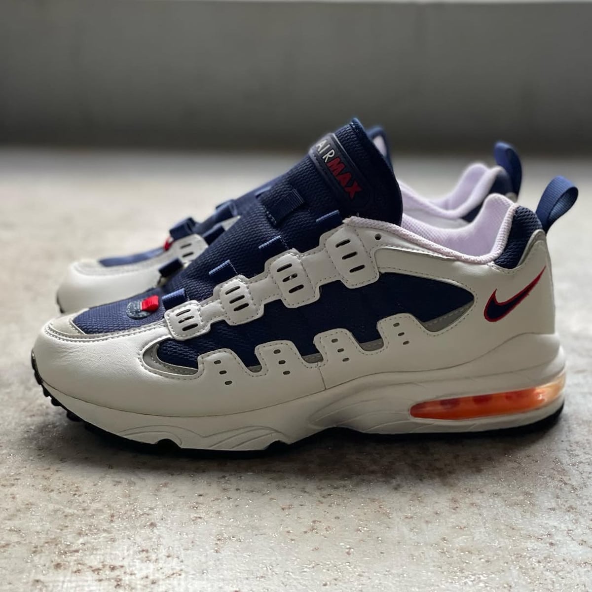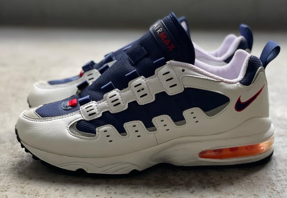Nike avait visiblement de l’ambition pour ce modèle puisqu’ils ont sorti plusieurs coloris dont une version femme et une en cuir noir, ce qui prouve que c’était pas une Air Max jetable parmi d’autres. Le coloris iconique reste le USA : cuir blanc, mesh bleu marine, coussin d’air orange. Indémodable.