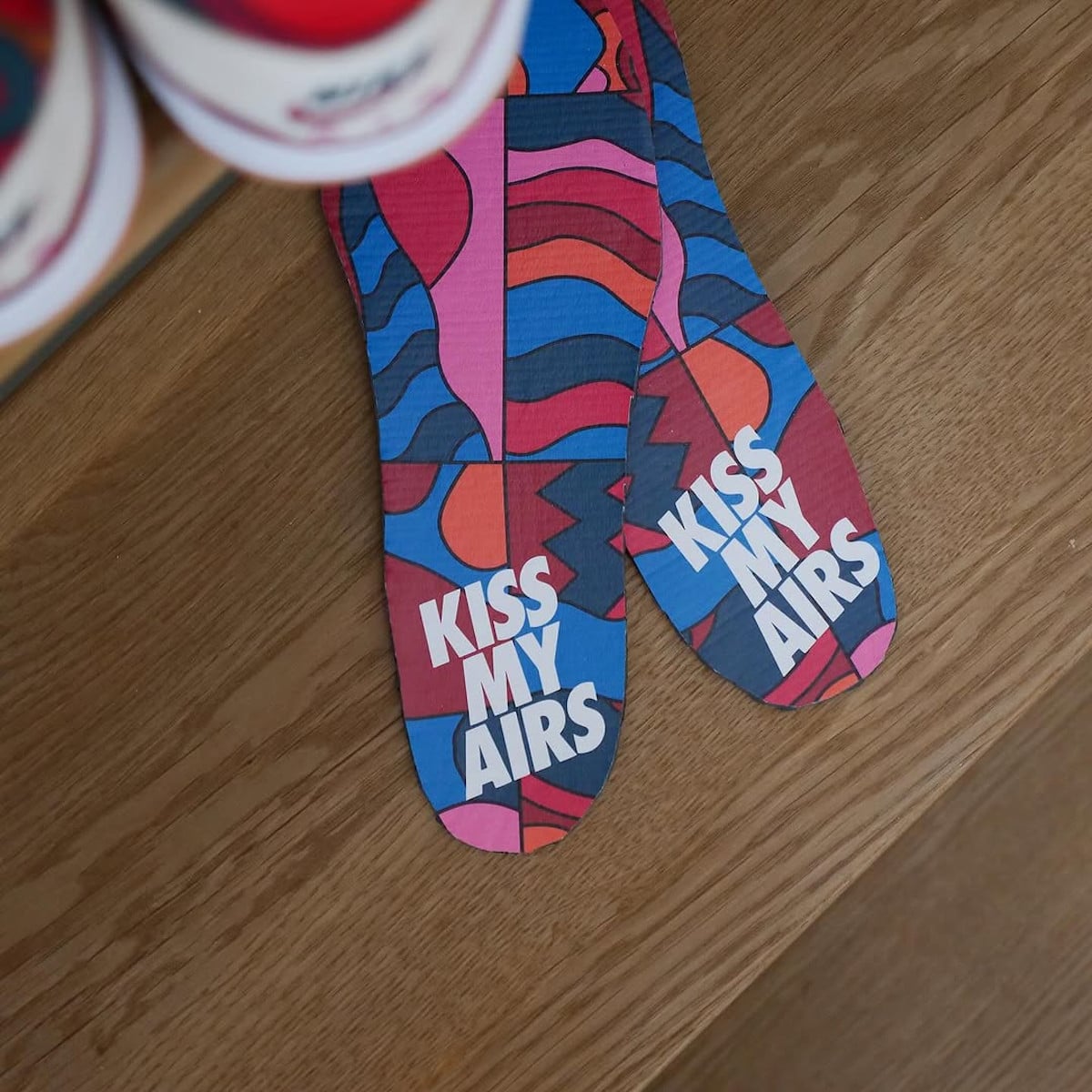 BOSZ s’installe, cuir blanc devant lui. Il attaque les overlays. Rose fuchsia, bleu électrique, rouge franc. Les formes géométriques de Parra prennent vie sous ses doigts. Pas de masking tape approximatif ici. Chaque courbe respecte le vocabulaire visuel du Hollandais. La toe box explose en couleurs comme un feu d’artifice Amsterdam. Le résultat est du niveau Bespoke. Vous savez, ce regretté programme où Nike facturait 800 balles pour une paire sur-mesure.