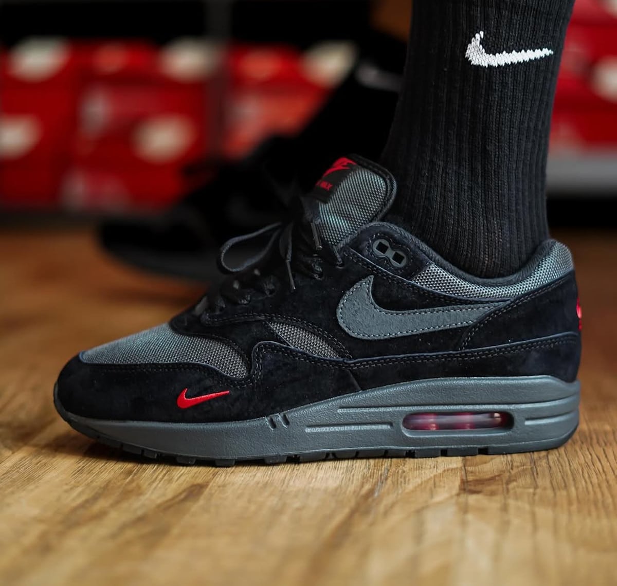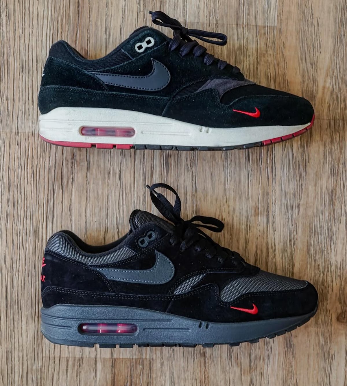 Une inspiration clairement assumée : la Air Max 1 Premium Bred de 2018 et non la One’s Love. Effectivement, la sneaker rouge et noire avait connu un franc succès et la firme de Beaverton a donc décidé de capitaliser sur ce modèle en proposant une mouture « améliorée ». Les similitudes ? En première approche, il est difficile de ne pas remarquer les ressemblances. En effet, on retrouve le rouge vif associé au noir, si cher aux Air Jordan 1 addict. On note également la présence du fameux mini-Swoosh rouge toujours aussi diablement efficace. En somme, cette nouvelle Air Max 1 Bred 2.0 reste fidèle à sa grande sœur commercialisée 5 ans auparavant. S’il est vrai que ces deux versions sont fortement similaires, Nike a tout de même apporter quelques innovations qui permettent de les distinguer. Tout d’abord, on peut observer l’apparition du gris anthracite sur le mesh de la toe box ainsi que sur la semelle intermédiaire. Ensuite, pour marquer un peu plus encore les esprits, la marque à la virgule offre un nouveau logo Nike Air Max au niveau du talon.