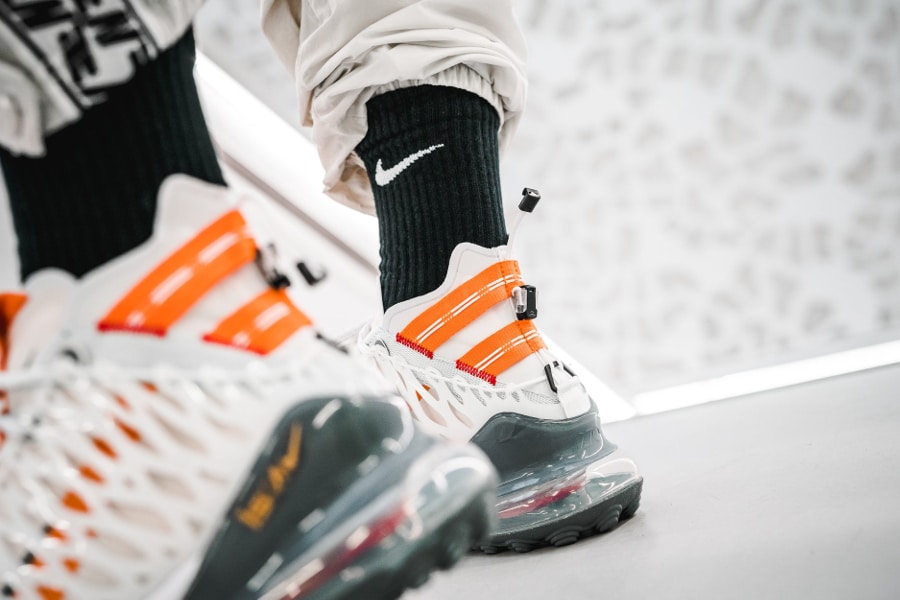 Improviser, chercher, protéger et adapter. Ces 4 verbes synthétisent l’essence de la collection Nike ISPA lancée en novembre 2018. Ainsi, nous avons découvert la React Runner Mid WR, une basket imperméable à l’amorti en mousse. Un second modèle vient élargir la gamme : la Air Max 270 ISPA. Plusieurs aspect retiennent notre attention. En premier lieu, la grosse bulle d’air associée à une semelle crantée pour un maximum d’adhérence. Ensuite, sa cage latérale présentant des découpes inspirées par les filets en plastique frappe par son esthétisme. Vous me donnerez votre sentiment mais la Air Max 270 mi-montante me fait furieusement penser à la Air Trainer Max 94. L’heure étant à la mise à jour des vieux modèles, elle a très bien pu servir d’inspiration.