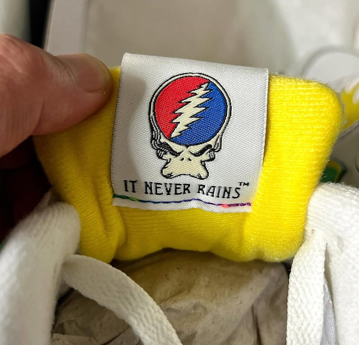 La paire mélange blanc cassé, vert et jaune des Oregon Ducks. Le mudguard en tie-dye rappelle les tenues bariolées des fans. Le Swoosh en chenille fait écho aux Nike SB Dunk Low de 2020. Mais regardez le talon. Le Stealie Skull apparaît en version canard sur la chaussure droite. Le hangtag transforme les Dancing Bears en Dancing Ducks. L’inscription « It Never Rains » sur la languette ? Une phrase culte d’un commentateur lors des concerts à Eugene. Chaque détail raconte un pan de cette histoire commune.