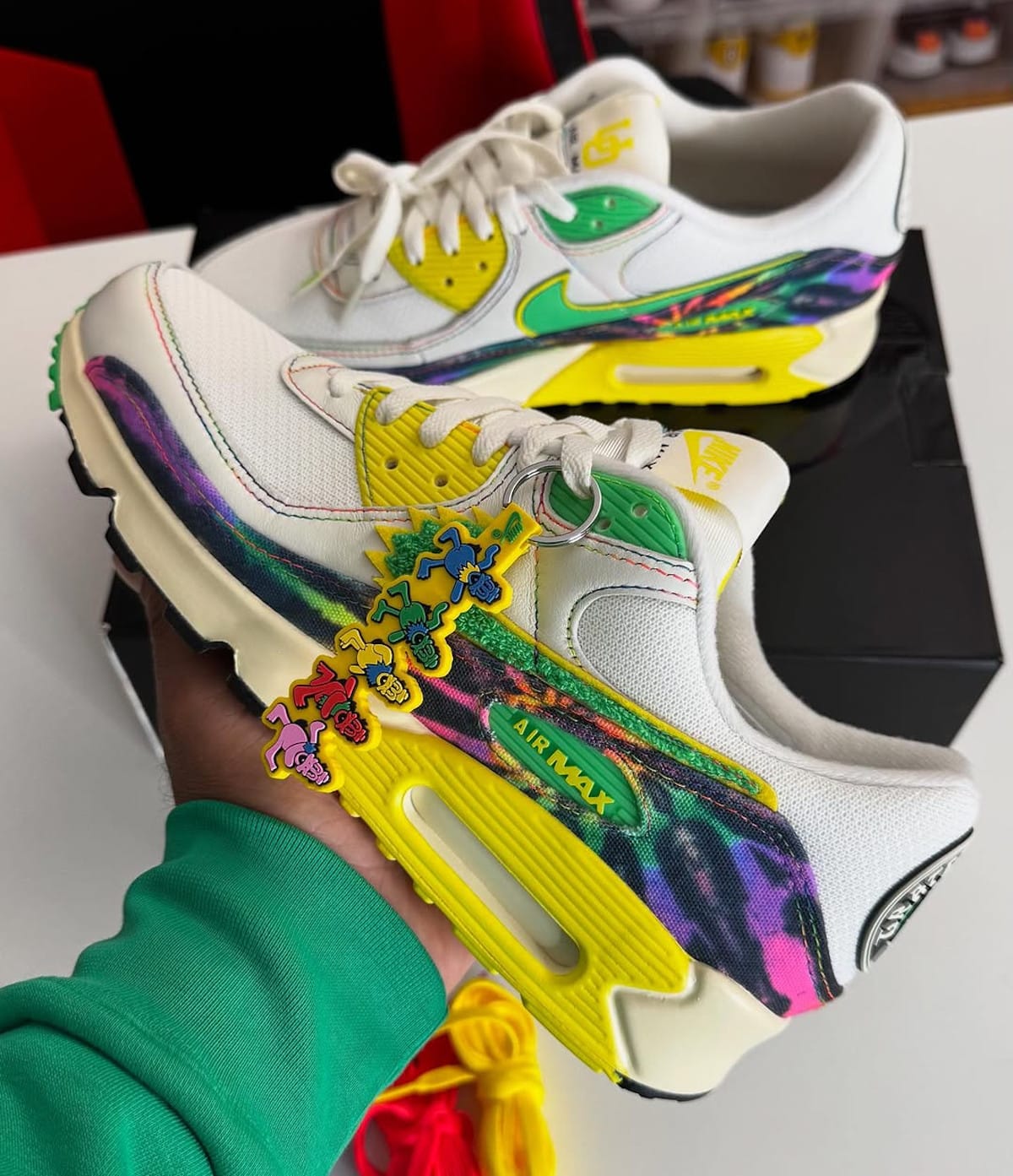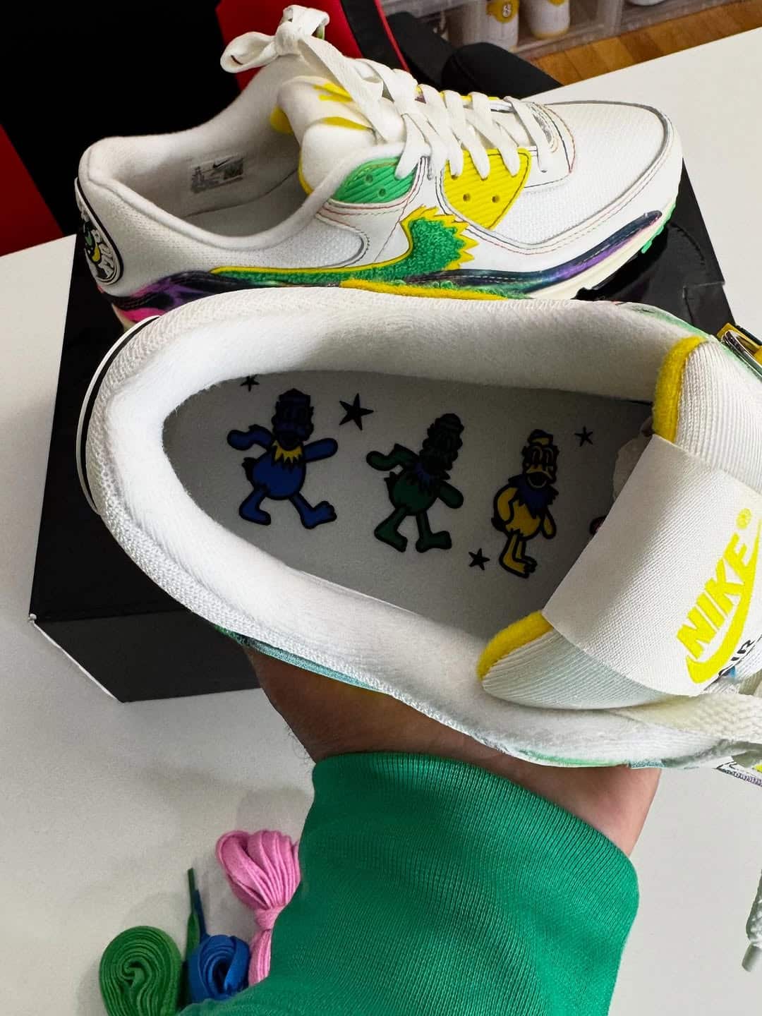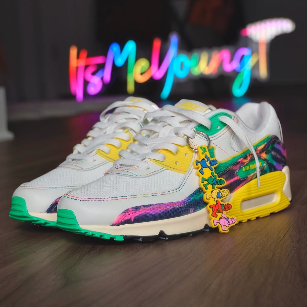La Grateful Dead x University of Oregon x Nike Air Max 90 Grateful Ducks pose une question simple. Pourquoi ce modèle précis et pas un autre ? La réponse tient en une photo. Juin 1990, Autzen Stadium à Eugene. Jerry Garcia monte sur scène avec des Air Max 90 Infrared aux pieds. Le modèle venait tout juste de sortir. Le guitariste avait adopté la silhouette. Cette image a marqué les Deadheads présents ce soir-là.