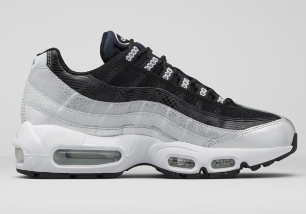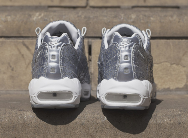 Depuis quelques semaines, je ne cesse de vous bassiner avec le 20ème anniversaire de la Air Max 95 (à voir aussi Air Max 95 Neon). Vu ce que la marque au Swoosh a préparé, je ne suis pas prêt de m’arrêter. Elle a concocté un pack qui se compose de sneakers qui brillent. Le modèle homme est en cuir platine jalonné par des motifs tracés au laser. L’empeigne de la version femme combine du mesh noir avec du cuir décoré par un imprimé safari.
