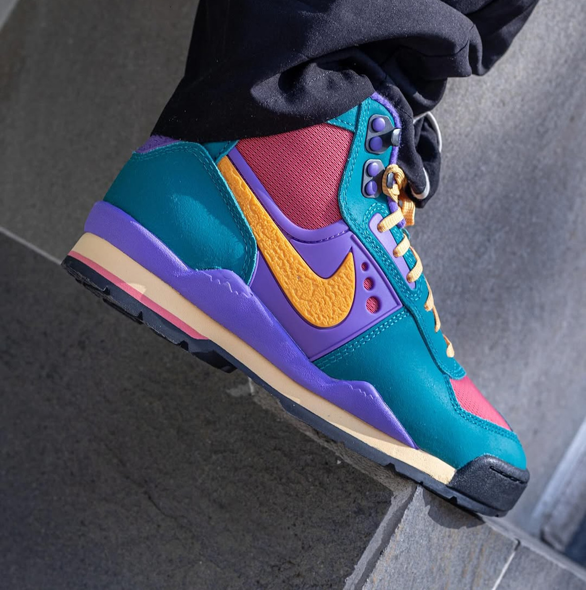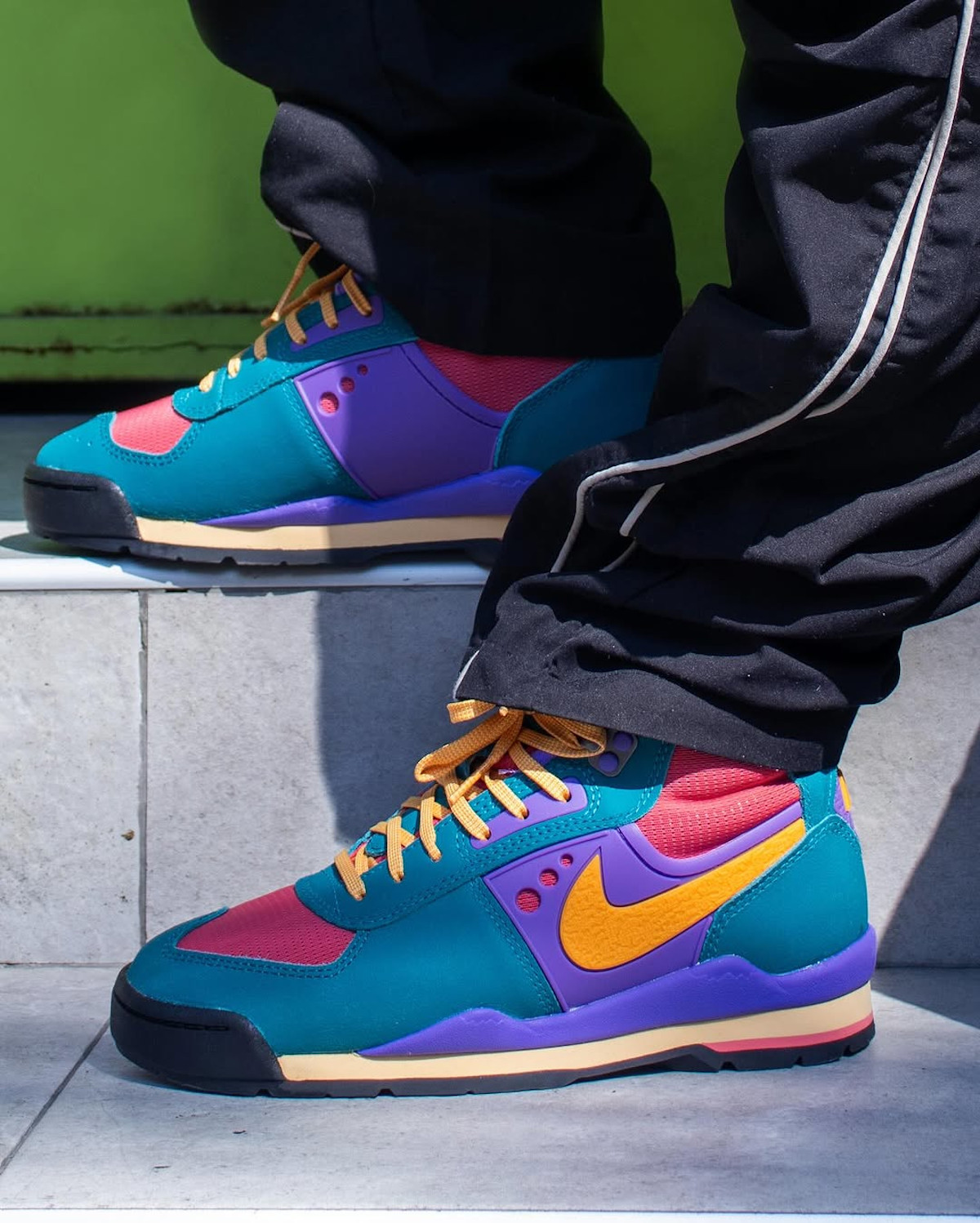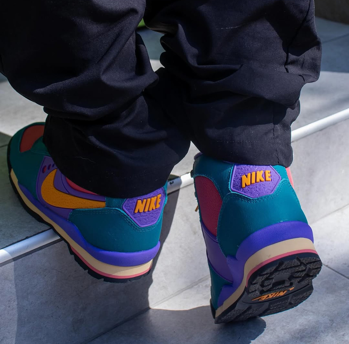 Il s’agit d’un come back mérité mais retouché. La Nike Air Baltoro multicolore arrive le 21 novembre pour 145 euros. Le profil a maigri. La coupe s’est abaissée. Nike a modernisé la silhouette pour la rendre plus portable au quotidien. Les puristes grinceront peut-être des dents. Pourtant, l’esprit y est. Le suède vert turquoise respire encore ce goût pour l’excentricité des premières ACG. Le mesh rouge rappelle que Nike savait déjà faire du bold avant tout le monde. Les overlays violets et le Swoosh doré texturé ? Ils signent cette époque où l’outdoor flirtait sérieusement avec le streetwear.