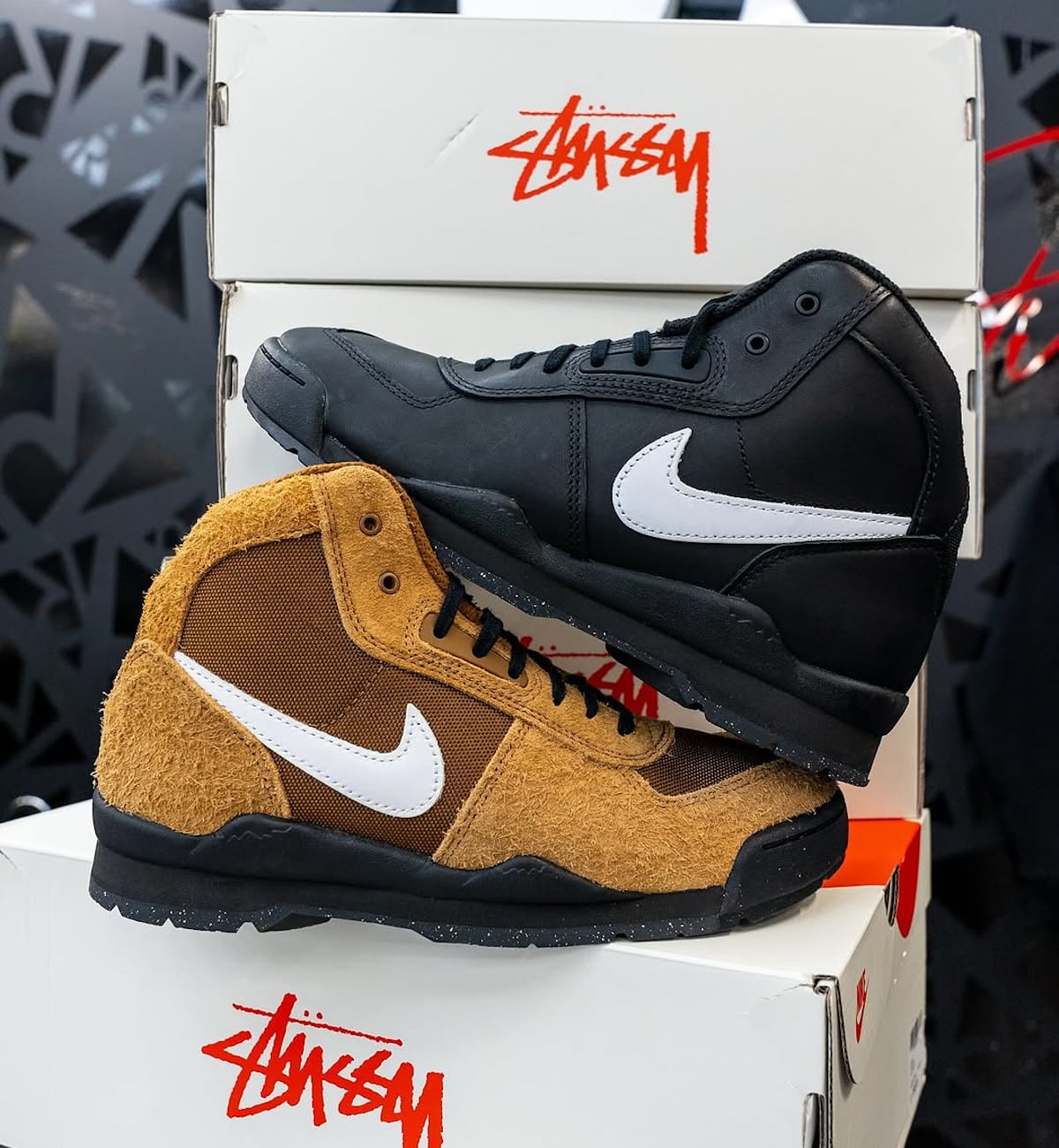 La Nike Baltoro x Stüssy Black White, lui, opte pour du bon cuir noir à l’ancienne. Plus lisse, plus facile à vivre aussi. On voit bien la différence de stratégie. Là où le Tan vous fait remarquer, le noir vous accompagne.