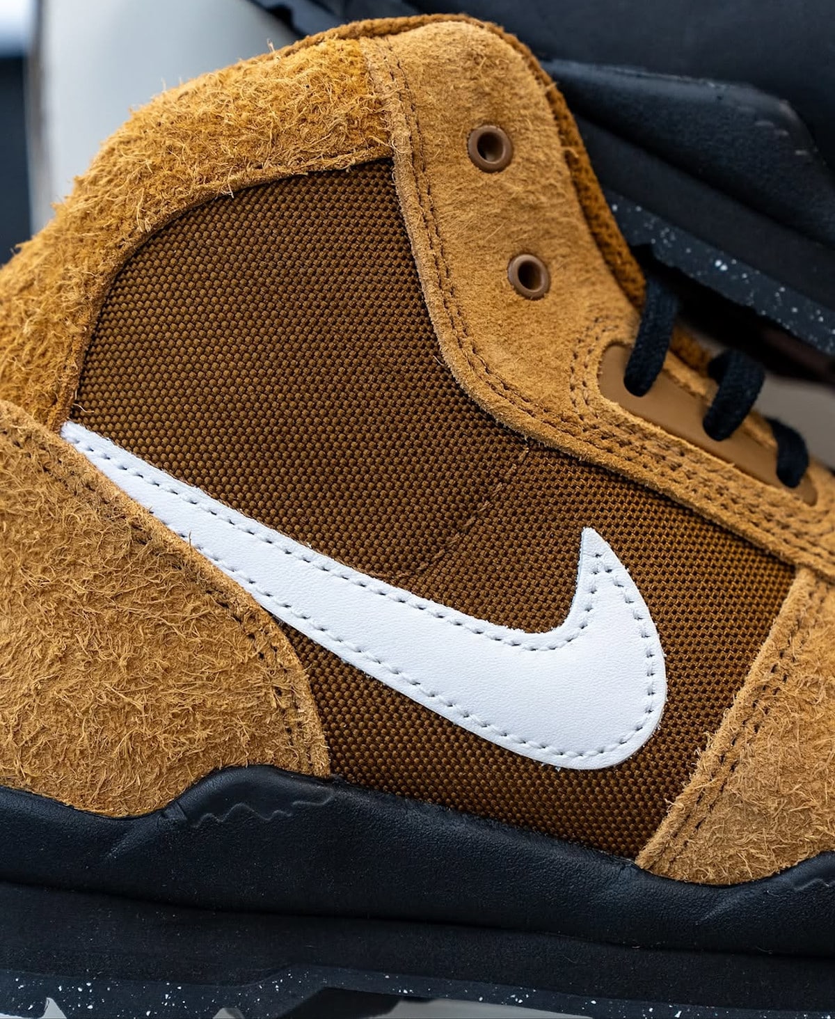 La Nike Baltoro x Stüssy Light British, c’est du daim duveteux beige qui a vécu. Pas celui des baskets de comptoir, non. Un suède avec du relief, presque vivant. Dessous, du ripstop tendu. Le genre de matière qu’on trouve sur les sacs de randonnée. Le Swoosh blanc tranche juste ce qu’il faut. Et puis cette semelle noire mouchetée qui rappelle… attendez, les Spiridon de 2021 peut-être ?