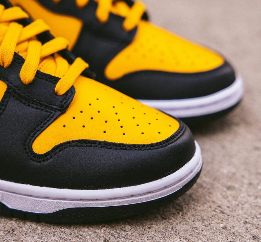 Des arguments permettent d’établir une connexion entre Homer Simpson et la Nike Dunk High Retro Blue Chill. A l’inverse, je ne comprends pas pourquoi la University Gold and Black est surnommée Reverse Goldenrod. Effectivement, sa tige combine du noir et du jaune comme la basket représentant les Iowa Hawkeyes. Toutefois, la teinte or université tire davantage vers l’orange. Le rouge habanero sur l’écusson l’éloigne un peu plus de la basket de 1985 aussi appelée Varsity Maize. Elle a un petit air de Nike Kobe 5 Protro Bruce Lee, non ? Il ne lui manque que les traces de griffes (une référence à Opération Dragon) pour que la similitude soit complète.