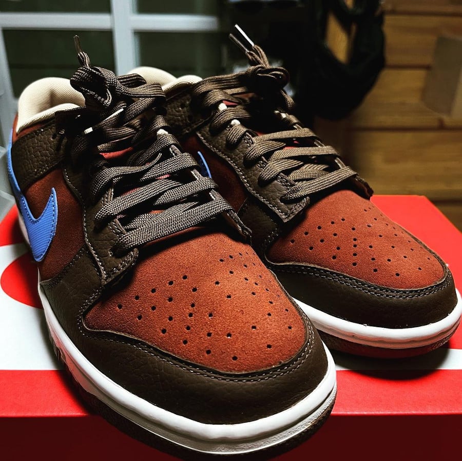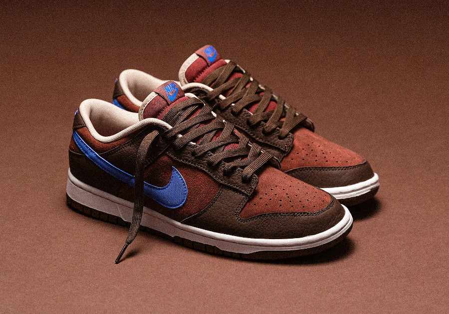 Un nouvel ovni atterri au sein de la collection Mars Stone. La Nike Dunk Low Retro PRM rejoint une série dont la Air Max 1 Sail Vintage Coral (les passionnés de la Air Max 90 vous diront la Magma Orange) reste la meilleure représentante. La Terry Swoosh et la Moon Fossil n’étant disponibles qu’en pointures femme, la chaussure possédant un Swoosh en tissu bleu comète réquilibre les débats. Elle aussi emploie du rouge oxyde. La nuance martienne sert à mettre en valeur le daim. Celui-ci s’accorde au cuir premium marron cacao wow. La doublure beige adoucit l’ensemble.