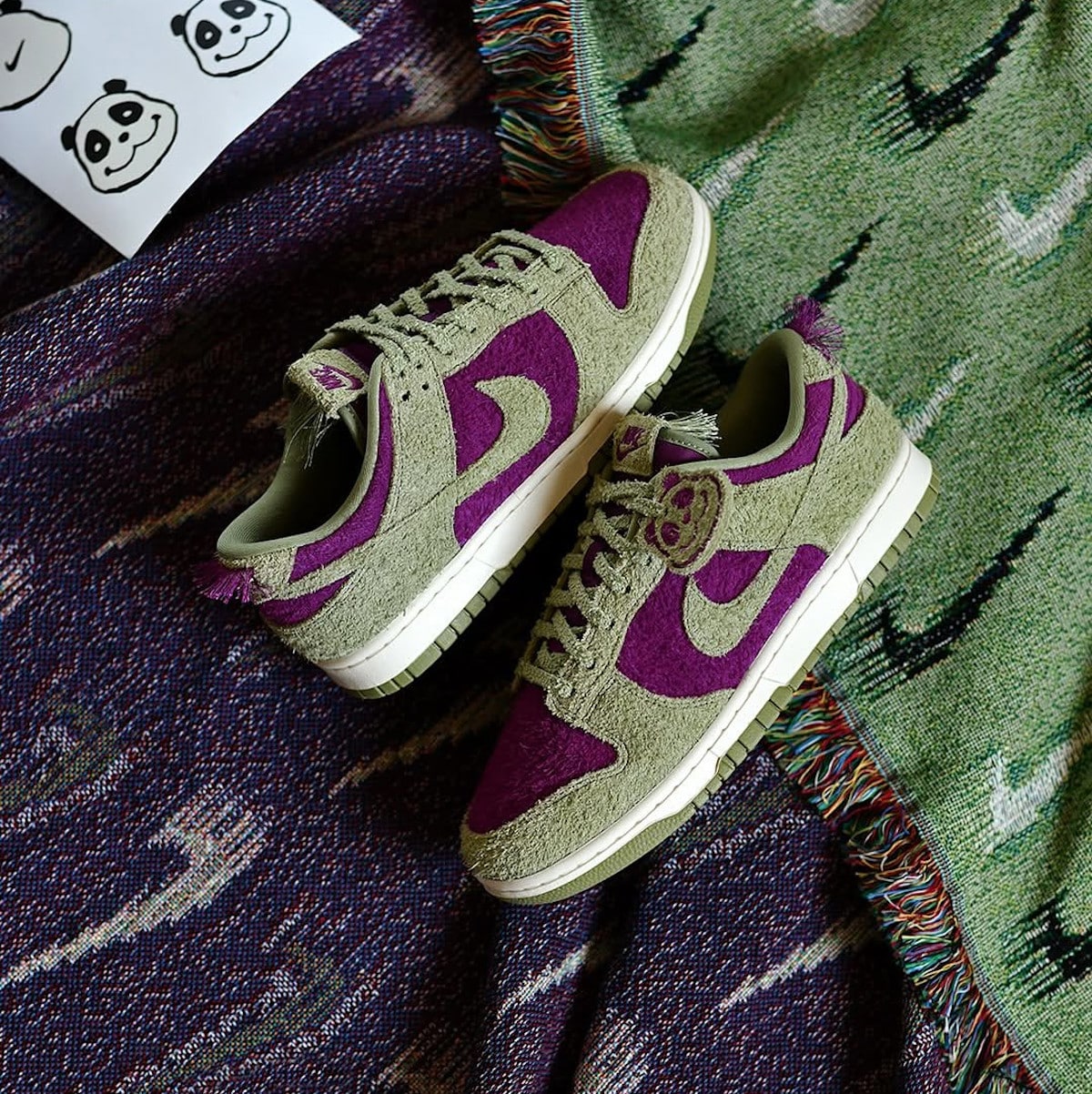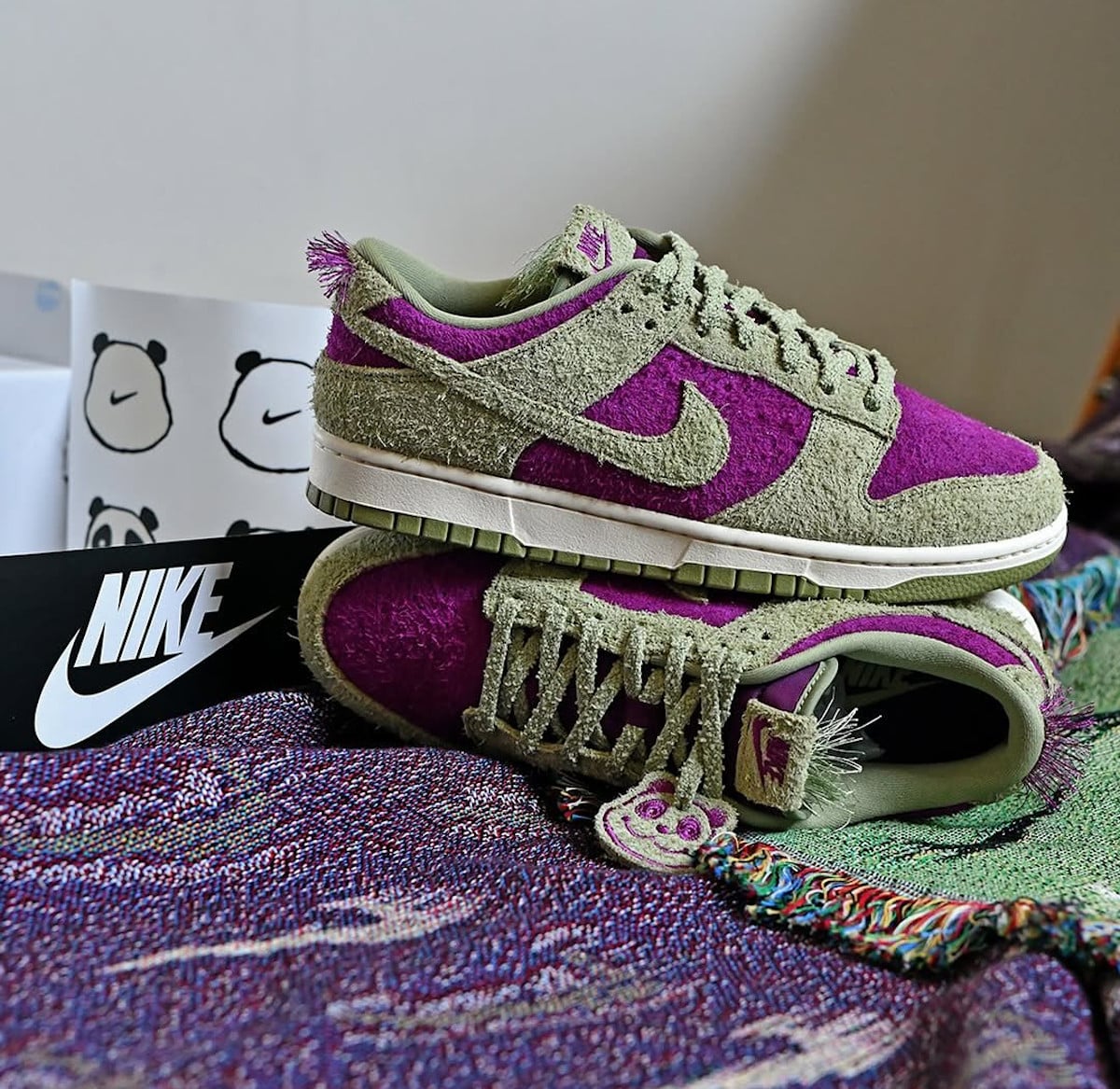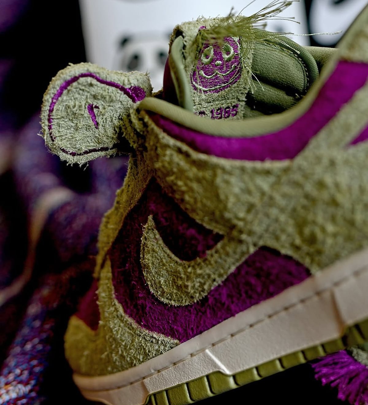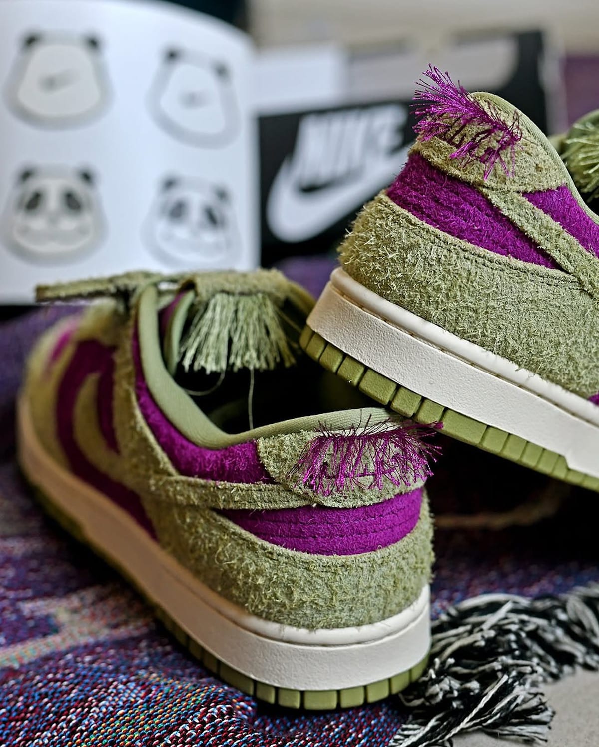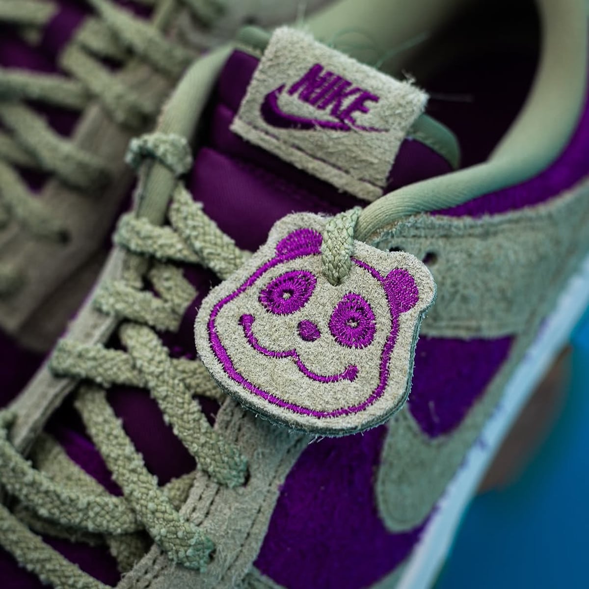 Le daim brossé, dense et texturé, capte la lumière comme un velours de scène. Le Swoosh olive tranche net sur le violet, pendant que la semelle crème et les lacets duveteux adoucissent l’ensemble. Et puis il y a ce pendentif panda, allusion assumée à la série Panda-Monium, qui donne un petit air joueur à la silhouette. À l’arrière, le logo Nike n’apparaît pas net et brodé comme à l’habitude. Il se présente volontairement effiloché, comme si le fil avait été tiré au hasard, laissant dépasser des franges irrégulières. Ce détail, loin d’être une erreur de fabrication, crée une impression de pièce artisanale, presque unique. On pense à ces patchs usés des vestes vintage ou aux coutures apparentes dans certaines collections streetwear japonaises.