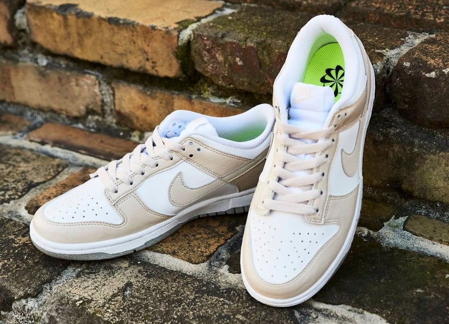 La Nike Wmns Dunk Low Next Nature est la grande absente du pack Air Sprung composé exclusivement de baskets se servant de matériaux recyclés. Le modèle de Peter Moore fait cavalière seule comme en témoigne la sortie de cette édition blanche et brun clair. Niveau construction, la Light Orewood Brown n’innove guère. Pareillement aux White Sail et Pale Coral, la Nike Move to Zero présente une tige bicolore. Sa semelle intérieure vert fluo affiche le Pinwheel Swoosh gage de son appartenance à la gamme éco-responsable. Dès lors que des petites taches sont visibles sur une semelle extérieure, on a la confirmation qu’elle se compose de Grind. C’est le cas de l’outsole grise de notre Nike Dunk Low NN.