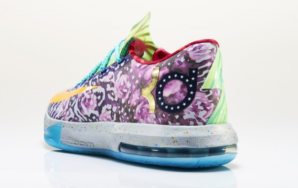 Le concept d’une Nike « What The… » est simple. Il consiste à assembler des motifs appartenant à d’anciens modèles sur une et même sneaker. Il a été popularisé par la Nike Dunk Low « What The Dunk » (2007). La KD 6 rejoint ce cercle très fermé. La What The KD emprunte des éléments graphiques à 35 modèles de la gamme Kevin Durant : Aunt Pearl, Maryland blue, Peanut Butter and Jelly, Easter…. Je vous laisse chercher les autres.