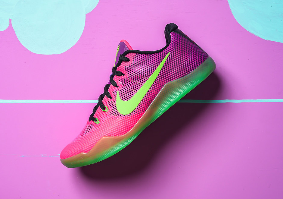 Les Nike estampillées « Mambacurial » établissent un pont entre le monde du foot et celui du basketball. Ce mot est formé à partir d’un des pseudonymes de Kobe Bryant et d’un modèle de crampons, la Mercurial. Vous rappelez-vous de cette photo où l’on voit l’ancien joueur des Lakers avec Ronaldinho ? Tout le monde connait sa passion pour l’univers du ballon rond. Nike nous offre une Kobe 11 qui emprunte le design de la Mercurial Vapor 9 : teinte rose, accents fluo et logo Nike surdimensionné. Elle est quasi-identique à la Kobe 8 ‘Mambacurial’ de 2013. Une édition spéciale qui sera en vente (160€) le jeudi 15 septembre au Nike Store.fr (à 9 heures).