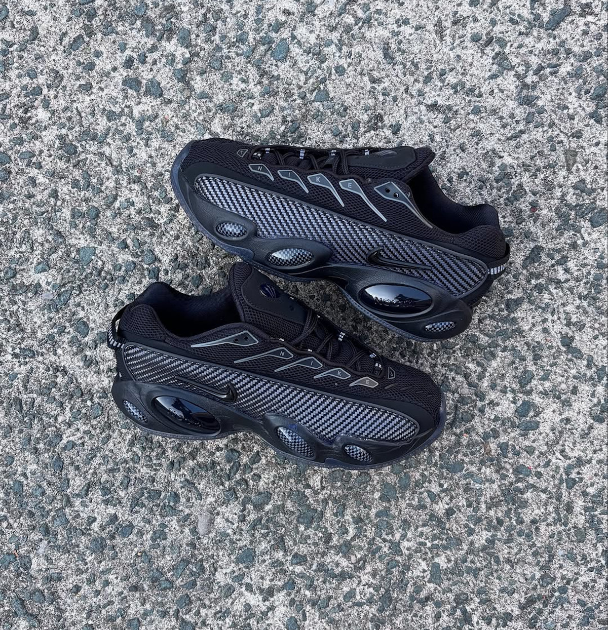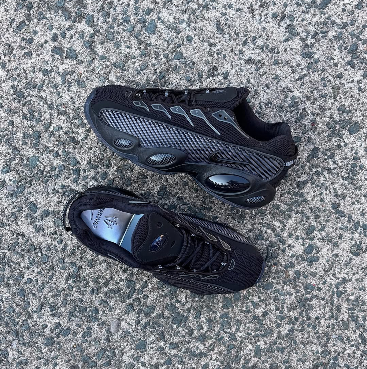 Alors là, on entre dans du sérieux. Mesh noir sur l’empeigne respirant, merci bien, renforcé par des panneaux en fibre de carbone. Et pas du toc hein, de la vraie fibre visible à travers les découpes. Ça, c’est du détail qui compte.
