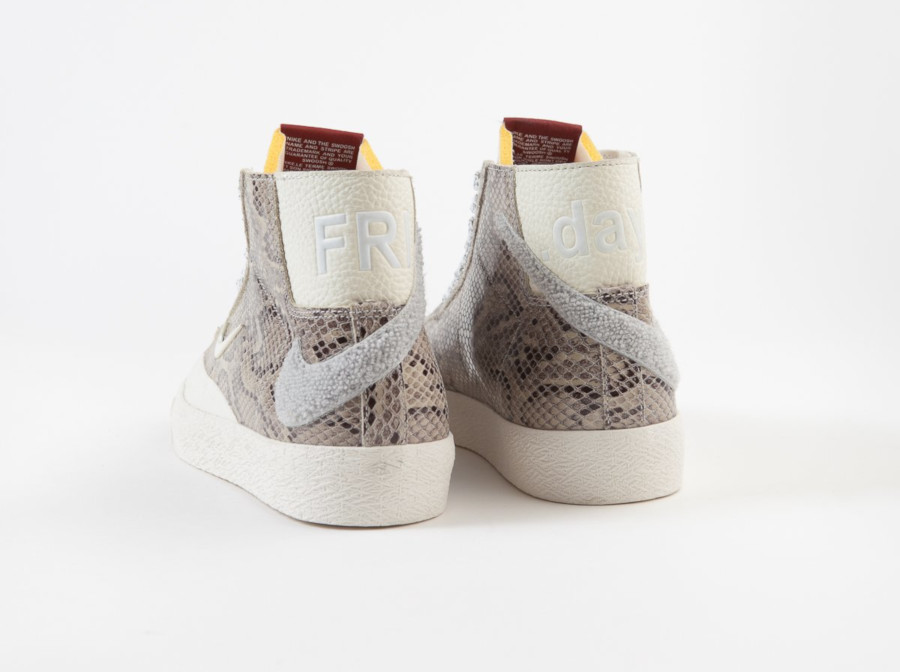 Soulland et Nike ont lancé le projet FRI.day en 2016. Le premier drop contient uniquement des Nike SB Eric Koston. Le second sorti en 2017 met à l’honneur les Nike Dunk SB High et Low. La Nike SB Blazer Mid est la star du 3ème volet. Le label danois s’est-il inspiré de la Air Max 98 Supreme ? L’imprimé peau de serpent beige force la comparaison avec la running en snakeskin. Le Swoosh en chenille au talon est le principal élément différenciant. Citons par la même occasion les lacets mouchetés, le Fri Day à la place du Nike à l’arrière ainsi que le gros branding sous la semelle d’usure.