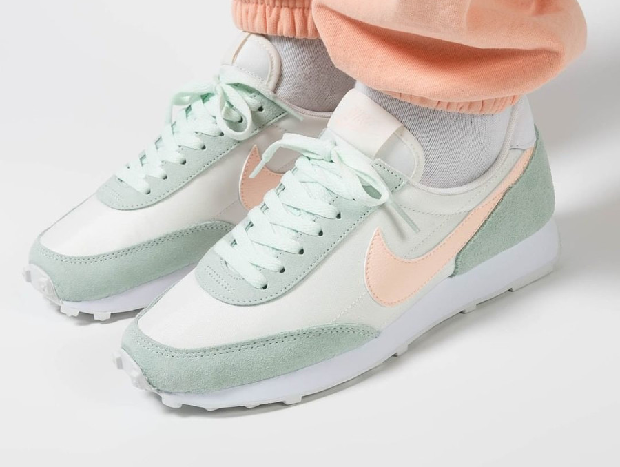 La Nike Wmns Daybreak Barely Green Sail Crimson Tint rejoint la collection Easter 2021 largement scrutée par la Air Jordan 1. Cette édition de la running rétro munie d’une semelle Waffle se signale au moyen d’une tige à dominante vert menthe. La nuance du nylon s’avère davantage claire que celle du suède. Il en résulte un léger contraste. Une autre couleur tendre l’accompagne. Du rose pastel habille le Swoosh de notre DBreak. La nuance adoucit le logo Nike présent à l’arrière et sur l’écusson. En vente au prix de 89.99€ au Nike Store.fr : voir la paire.