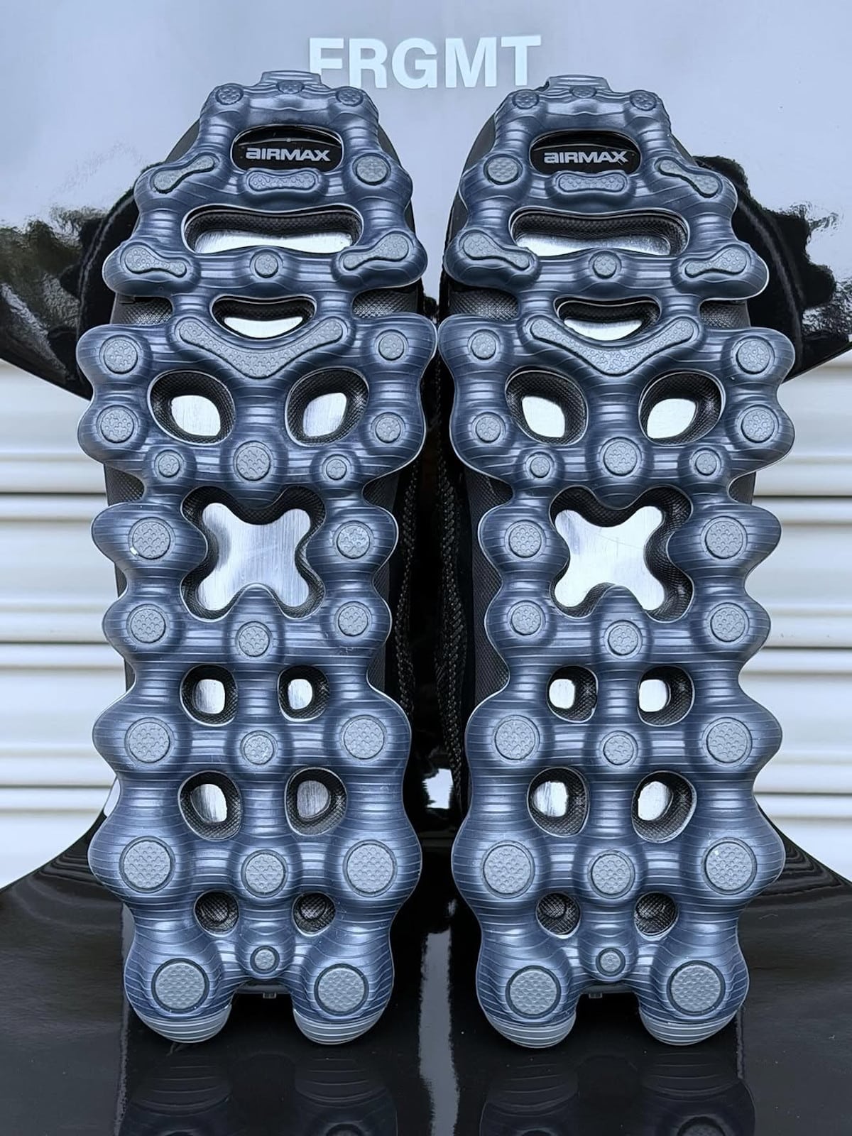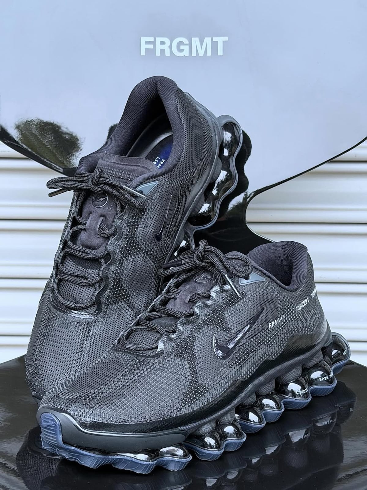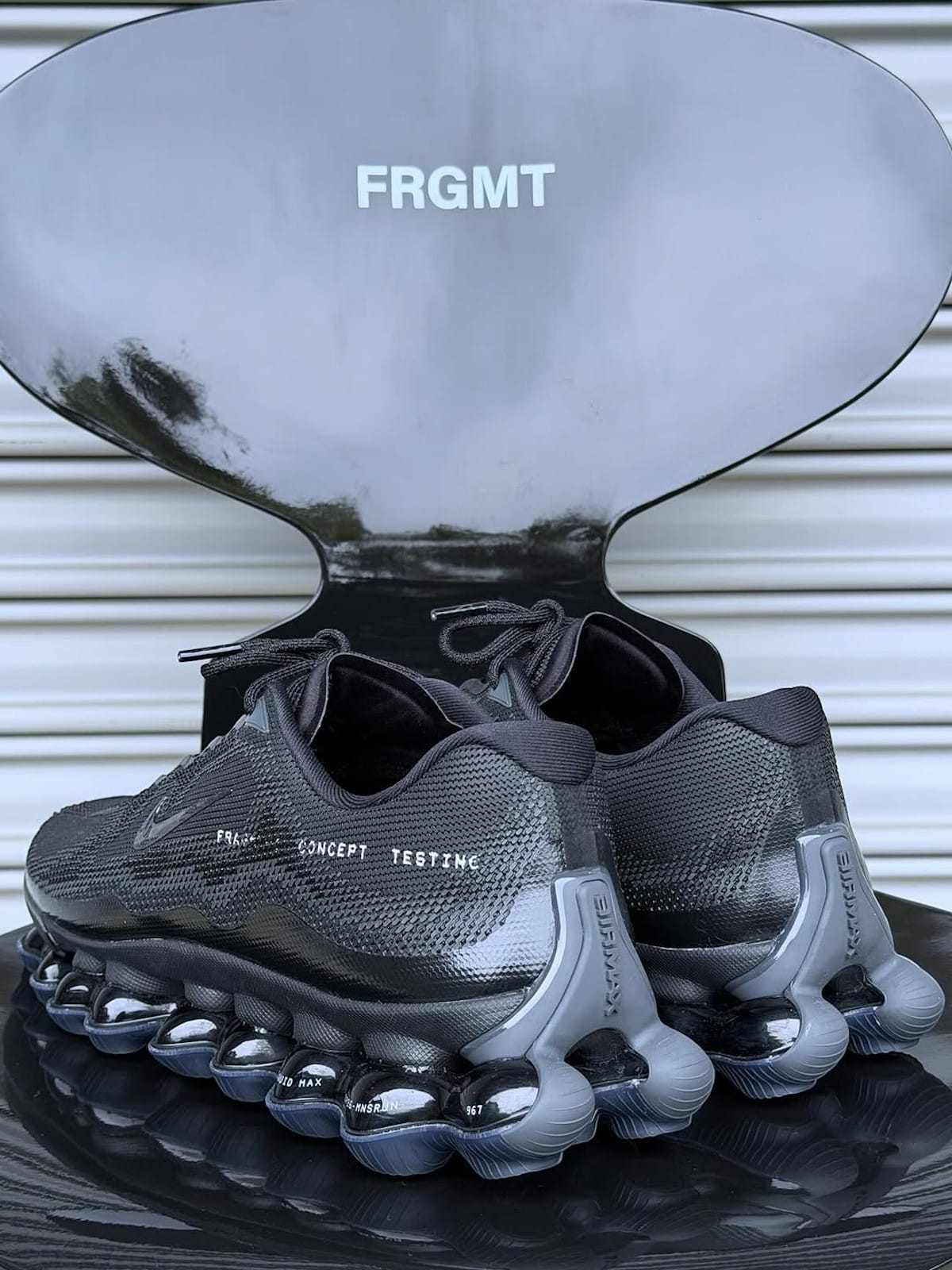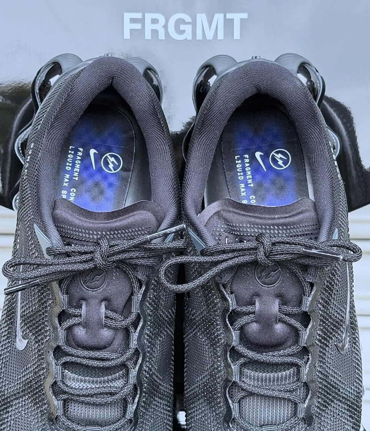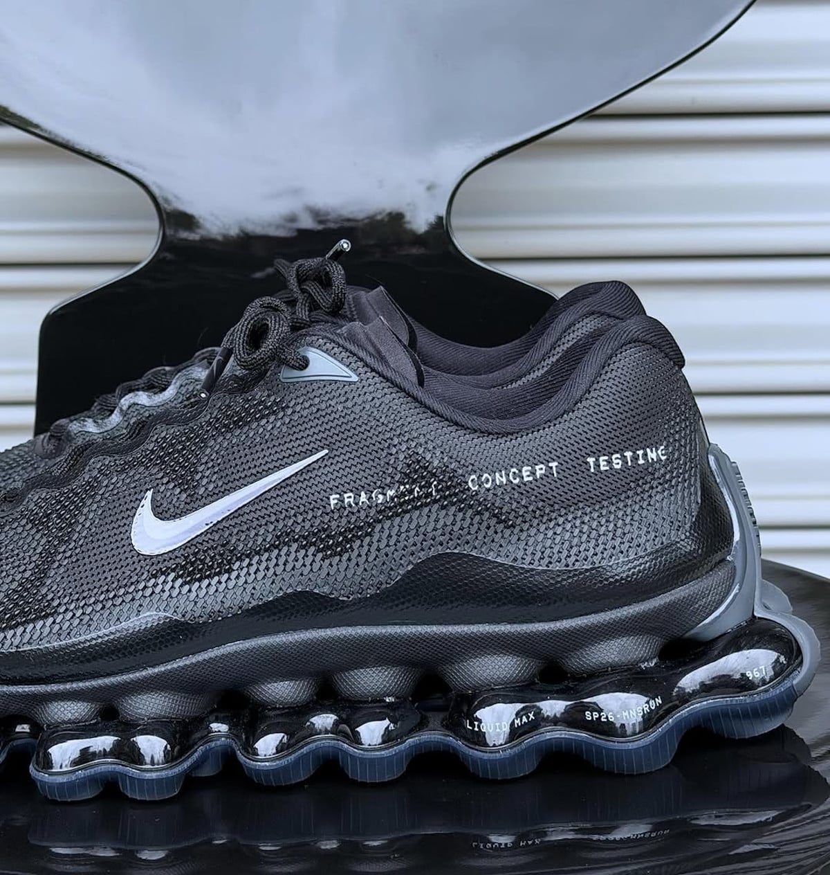 Mais concrètement ? La Nike Air Liquid Max x Fragment, c’est un coloris noir anthracite, un bleu planqué sur la semelle intérieure, du texte industriel sous le col, puis l’éclair au talon. Je ne t’invente rien. C’est exactement ce qu’on attendait. La silhouette change, cependant, la grammaire esthétique, elle, ne bouge pas d’un millimètre depuis dix ans.