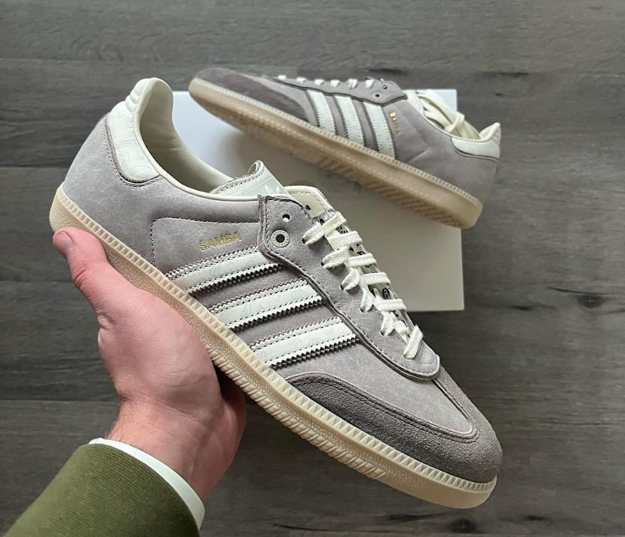 On finit notre notre tour de la collection Consortium Cup avec la Offspring x Adidas Samba Paisley. Entre celle-ci et la adidas Centennial Low 85 Crafted, vous avez de quoi faire.Il n’est pas rare que les grandes marques s’associent avec des shops spécialisés pour imaginer des éditions limitées ou des modèles exclusifs. C’est le cas de cette Samba, fruit du travail commun entre la célèbre marque aux trois bandes et la boutique londonienne. Pour cette collaboration, Offspring a souhaité célébrer sa ville d’origine, Londres, en optant pour un coloris en nubuck gris rappelant l’ambiance urbaine de la capitale britannique. Les lacets dans une teinte beige contrastent subtilement avec le reste de la chaussure tout en apportant une note de douceur. Raffinement ultime, les fameuses trois bandes sont réalisées en cuir blanc et cachent un motif typiquement anglais. En effet, au fur et à mesure que le cuir s’use, on peut voir apparaître un motif cachemire. Il a notamment été popularisé par les groupes de rock et les icônes de la mode britanniques des années 60 et 70. Cela confère à la Offspring x Adidas Samba Paisley une personnalité rare et une élégance discrète.