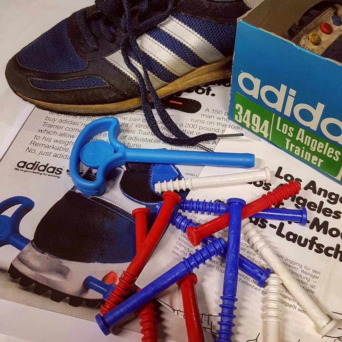 Trois petits plugs amovibles dans la semelle intermédiaire. Rouge, blanc, bleu. Le système Vario permettait d’ajuster l’amorti selon votre poids ou le bitume sous vos pieds. Vous trouviez la chaussure trop ferme ? Hop, vous retiriez un ergot. Génial sur le papier. Elle débarque en pleine guerre froide des baskets. Cette technologie répondait aux semelles Air de la concurrence (Nike Tailwind, Air Pegasus 83…). On retrouvera ces fameux pegs sur la Kegler Super, la Grand Slam et même la Handball 5-Plug qui en comptait cinq.