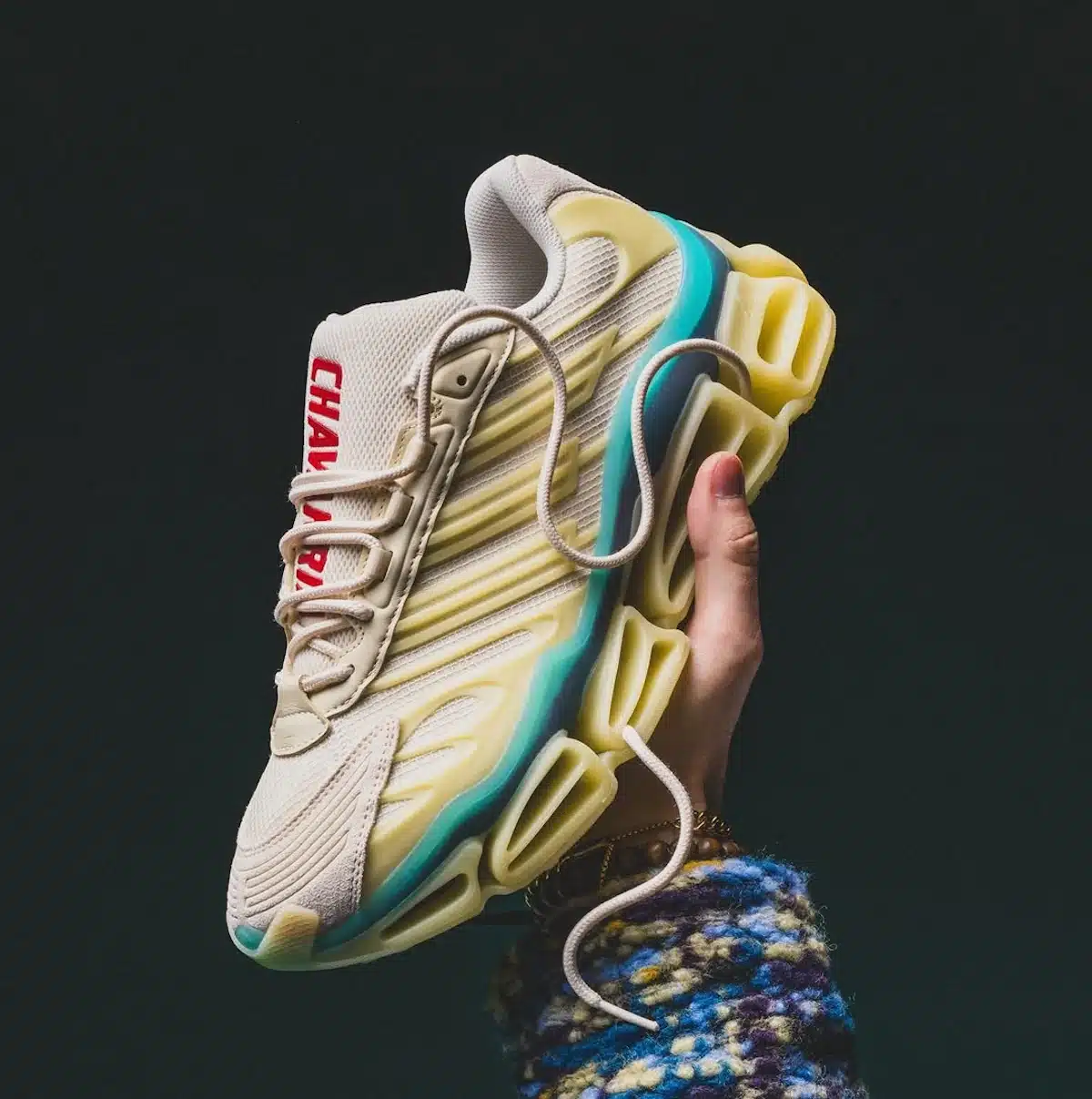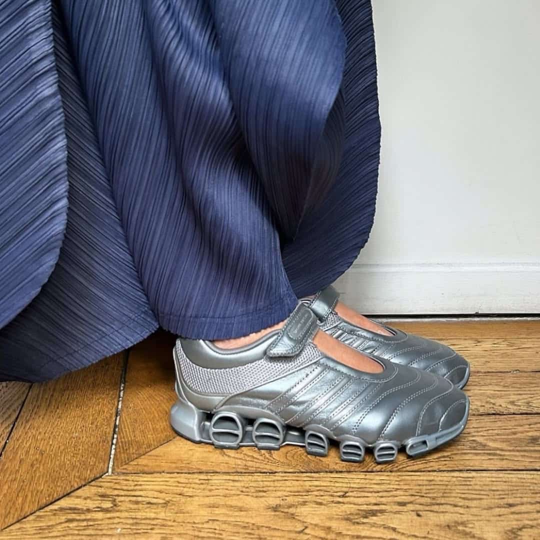 Et puis arrive le moment où tout part en vrille à la Paris Fashion Week du mois de juin 2025. Willy Chavarria envoie la adidas Megaride AG sur son runway SS26 en 3 versions. Une “normale”, une XL complètement démesurée, et une avec une coque TPU tout droit sortie d’un cauchemar cyberpunk. James Harden débarque avec. Internet fait ce qu’Internet sait faire de mieux : il s’emballe. Le running du début des années 2000 passe du placard à la lumière.