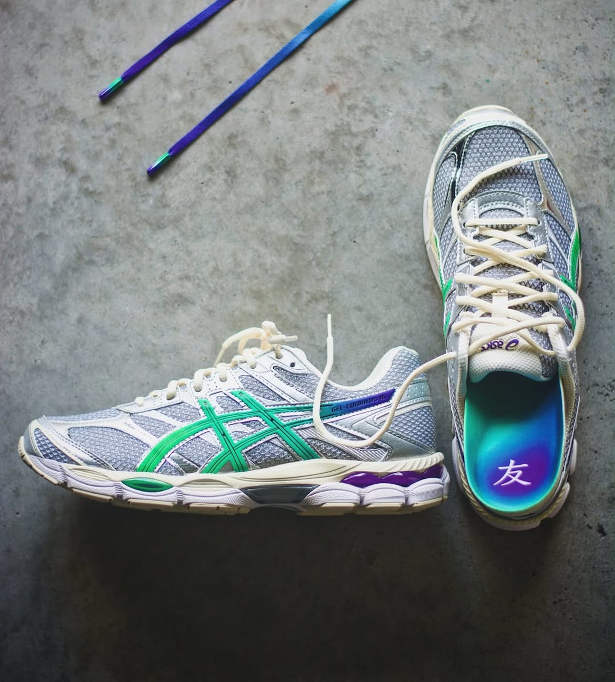 3 mois plus tard le projet Tomo débarque. 7 boutiques collaborent. Concepts. Extra Butter. Feature. Lapstone & Hammer. Somewhere. Sneaker Politics. The Whitaker Group. 2 jours de réunion à Boston. 4 concepts sur la table. Un vote collectif. Une seule paire retenue. Les Tiger Stripes adoptent un dégradé vert etviolet façon mood ring. Détail sympa : les caractères kanji « ami » figurent sur la languette gauche.