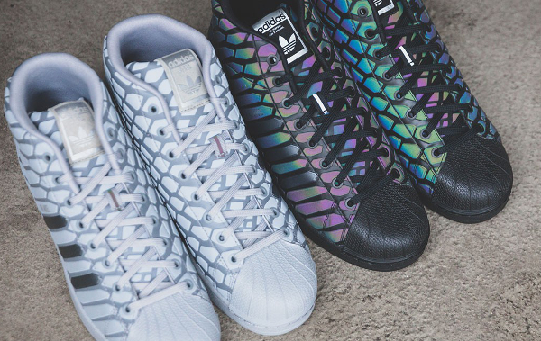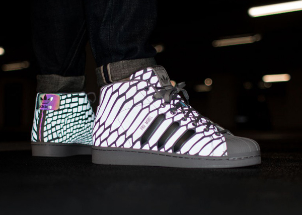 La Pro Model fait son entrée dans la gamme Xeno, est constituée des sneakers au goût de venin. La version montante de la Adidas Superstar se voit revêtue d’écailles embossées de Xenopeltis, qui deviennent multicolores sous l’effet de la lumière (à voir aussi Adidas ZX Flux ‘Xeno’). Elle existe en 2 versions, noire ou grise. En vente (120 euros) chez Adidas.fr : voir les paires.