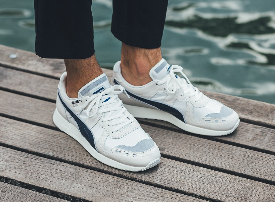 Le style de la Puma RS-100 PC ‘Vaporous Gray Peacoat’ s’avère un peu plus vintage en raison s’une semelle blanc cassé. La midsole se marie bien à la tige en suède beige et en mesh blanc. Sur sa languette en néoprène, l’écusson arborant le logo fauve bondissant emploie une teinte plus claire que celle de la bande latérale. En vente au prix de 100€ chez Puma.fr.