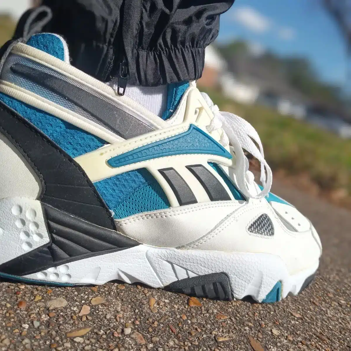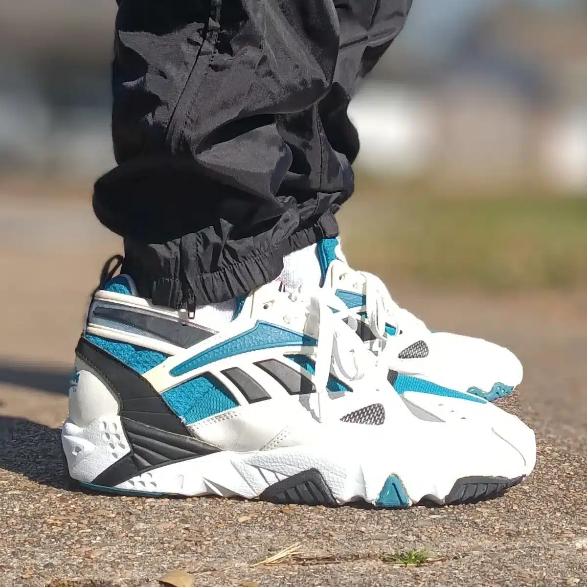 Base blanche. Touches turquoise qui claquent. Le logo Vector qui forme une cage sur les flancs. C’est propre. C’est efficace. Ça paraît sobre. Mais ça se fait remarquer quand même. Vous pouviez la porter en salle. En ville. Elle passait partout sans forcer. Sauf au bureau. La démocratisation de la sneaker n’était pas encore à l’ordre du jour. Vous l’aurez compris. Il s’agissait d’une bonne paire bien foutue. Et parfois, ça suffit amplement.