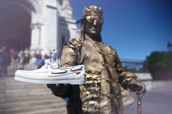 On ne change pas une équipe qui gagne ! Pour la 3ème année consécutive, Cool Cats et Sebago s’associent pour la création d’une Docksides. J’ai déjà eu l’occasion d’évoquer le retour de cette marque (voir mon article, « La marque Sebago doit-elle sa renaissance à ses collaborations avec Colette, Cool Cats, Ronnie Fieg et Stash ? »). Quel est le fil conducteur de cette nouvelle collaboration ? Cette Sebago porte le nom Club 75, en référence au groupe formé par DJ Medhi, Busy P, Justice et Cassius à l’occasion de Coachella 2010. Elle rend hommage à la capitale parisienne avec ses couleurs bleu, blanc, rouge.