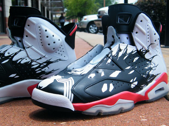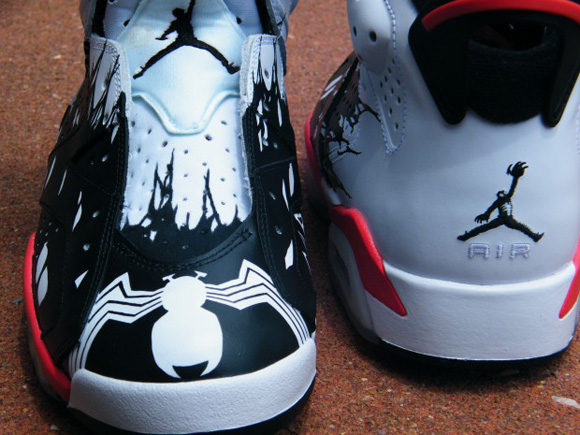 Le sujet de l’expérimentation « customisation » du jour est une Air Jordan (VI) White Infrared. La paire a été customisée par El Cappy. Il s’était déjà illustré en réalisant la Air Jordan 6 South Beach. Vous connaissez tous Venom, ce fameux personnage dans Spiderman ?!!! Il s’est inspiré de ce dernier pour créer ce modèle. L’idée est assez audacieuse. La Air Jordan 6 (VI) Venom apparaît comme une paire plutôt réussie….