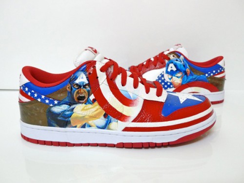 Alors que Stussy vient de commercialiser une série de tee shirts s’inspirant de l’univers des comics, un artiste a eu la lumineuse idée d’élaborer une Nike Dunk à l’effigie de Captain America. Vous pouvez la commander ici.