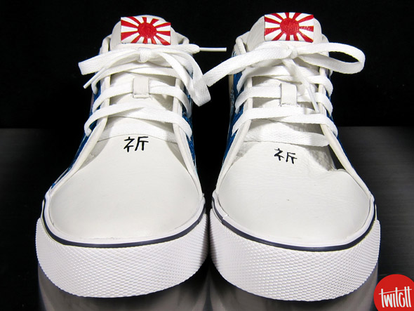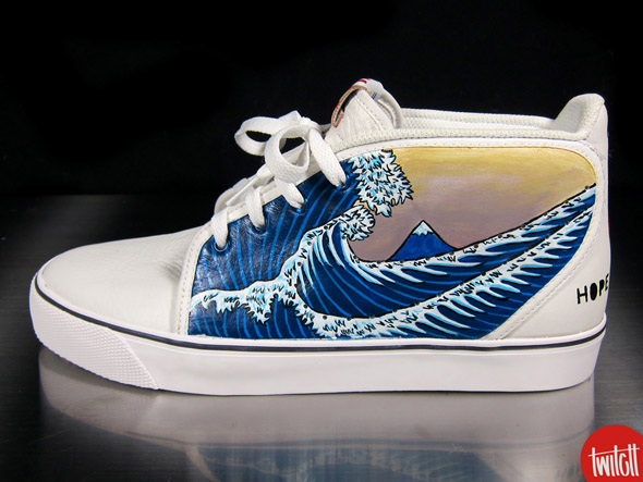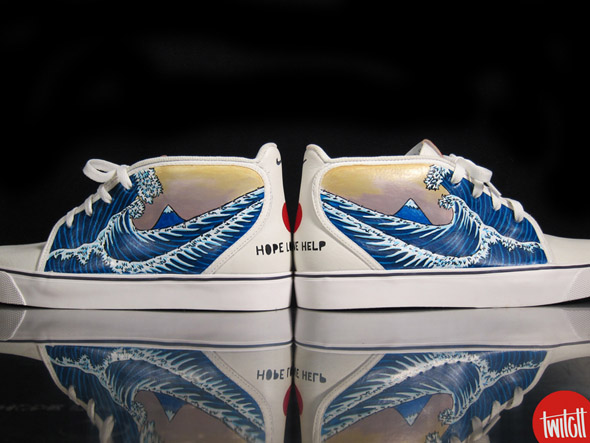 Au mois de mars, le Japon a été frappé par un terrible tremblement de terre. Plusieurs initiatives ont vu le jour pour venir en aide au pays du soleil levant. L’univers de la sneaker n’est pas en reste. Cette Nike Toki s’inspire de la célèbre estampe « La Grande Vague de Kanagawa », Katsushika Hokusai. Elle doit son design à Ryan Altianzar. Bravo !