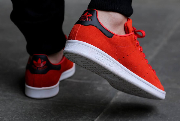 Du feutre, du denim, du cuir craquelé… Les dernières Stan Smith utilisent une panoplie de matériaux. Quant à elle, la Red/Core Black se compose d’un joli suède rouge, avec une partie du talon en cuir noir.