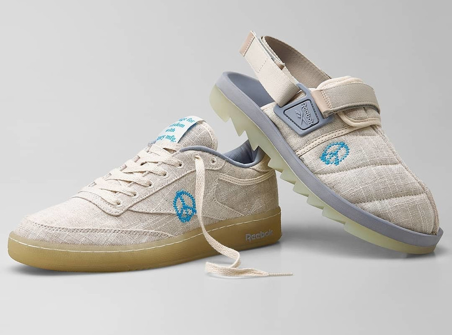 Manufacturing Garments ne déroge jamais à ses engagements écologiques et pacifiques. La collaboration avec Reebok Classics est un moyen de donner un échos mondial à sa cause. Le slogan Forage for Wisdom sur les patchs est tout sauf trompeur. Les Reebok x Story MFG Club C 85 & Beatnik Non Dyed Hemp sont conçues au moyen de coton biologique et de lin. Les matériaux biodégradables confèrent une apparence unique à ces chaussures écoresponsables. La Reebok Club C 85 (prix : 120€) est dépourvue de l’Union Jack. Saeed et Katy Al-Rubeyi l’ont délogé à la faveur du symbole de la paix. Le logo de Gerald Holtom est aussi brodée sur la sandale Reebok Beatnik que vous pourrez porter avec une tenue décontractée. En vente chez Reebok.fr : voir la Club C ou voir la Beatnik.