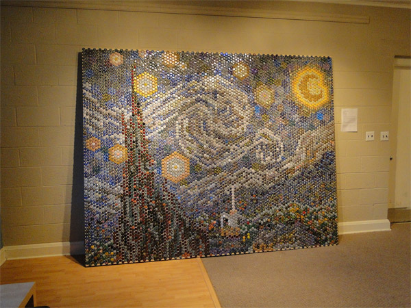 Des artistes se sont amusés à revisiter le tableau Van Gogh, « La nuit étoilée« . Où est l’originalité ? Pas moins de 8000 bouchons de bouteilles ont été utilisés pour sa conception.