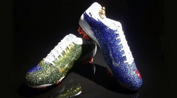 La marque Swarovski a encore frappé ! La marque pour les produits en cristal a imaginé cette Nike Mercurial Vapor Superfly 2. Elle reprend les couleurs de l’équipe de France et du Brésil. 5000 cristaux ont été incrustés sur la paire. Je vous laisse imagner le prix final sachant que la Nike Mercurial Vapor Superfly 2 vaut déjà 325 euros et les cristaux, 1530 euros. Les fans de bling bling seront ravis !